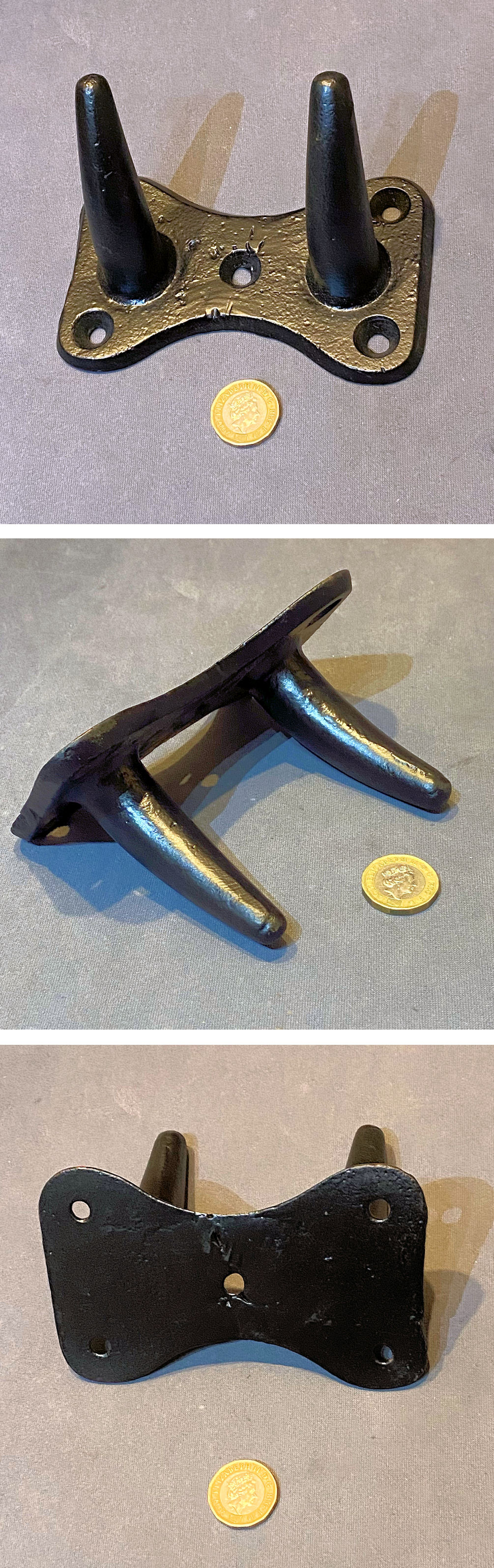 Double Cast Iron Harness Room Hook HR147 Original, quality late 19th century cast iron harness room, double wall mounted tack cleaning hooks. This pair of chunky hooks is cast all in one with the shaped backplate, with five countersunk screw holes for wall mounting. All has been cleaned and repainted black and has a good repair to the backplate. All is now complete and in good and working order.
