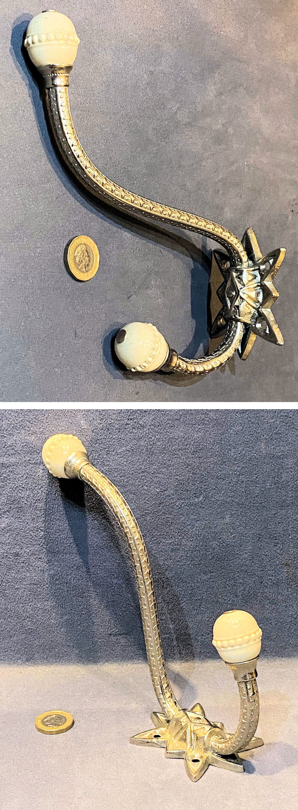 Large Nickel Plated Hat & Coat Hook, 2 available CH142 Original, quality late 19th century larger than average nickel plated coat hook with a decorated tubular stem on a cast nickel backplate with four countersunk screw holes for mounting and mounted with ovoid shaped off white ceramic finials. All has been polished and lacquered, although the lacquer may be removed at no extra cost and is complete and in good and working order.