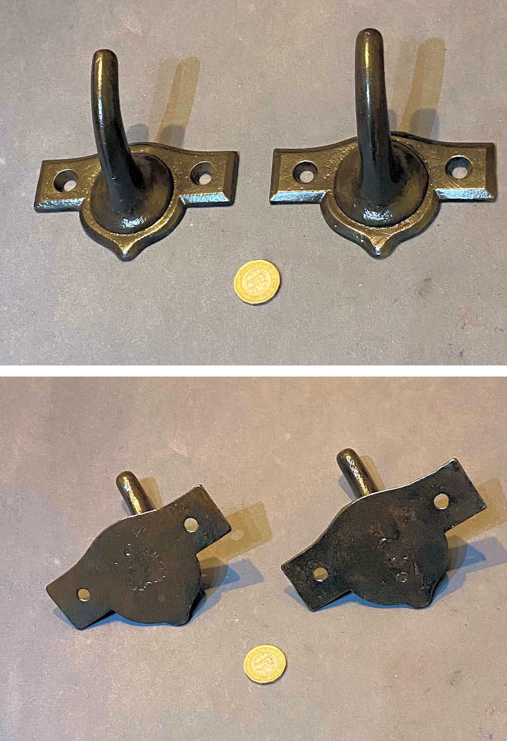 Pair of Cast Iron Harness Room Hooks HR146 Original, quality pair of late 19th century cast iron harness room tack cleaning hooks. Each has a chunky central hook with a shaped backplate with two countersunk screw holes for mounting. Cleaned and lacquered and complete and in good and working order.