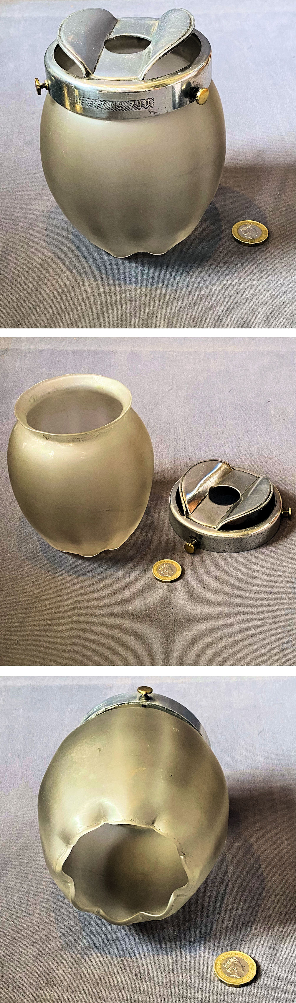 Frosted Glass Lamp Shade S657 Original, quality late 19th century frosted glass gas lamp shade. The original aluminium gas shade holder was drilled out to fit a standard, modern, electric bulb holder. This shade has an inverted wavy rim, and the shade holder is marked "Bray No 790". All is complete and in good and working order.