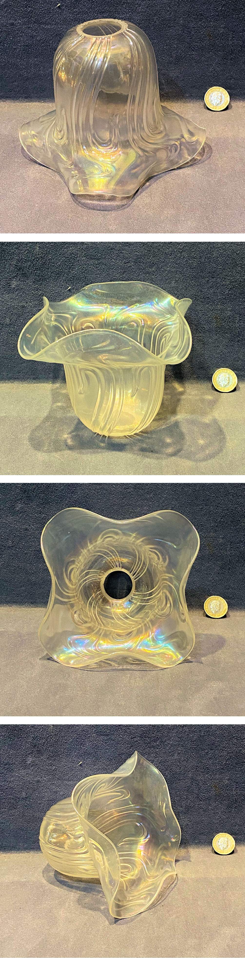Lustre Finish Glass Lamp Shade S658 Original, quality 1920's electric lamp shade with embossed Art Nouveau designs and a lustre finish. This handsome example has a four corner wavy outer rim and will fit a standard, modern, UK electric bulb holder. Complete and in good and working order.