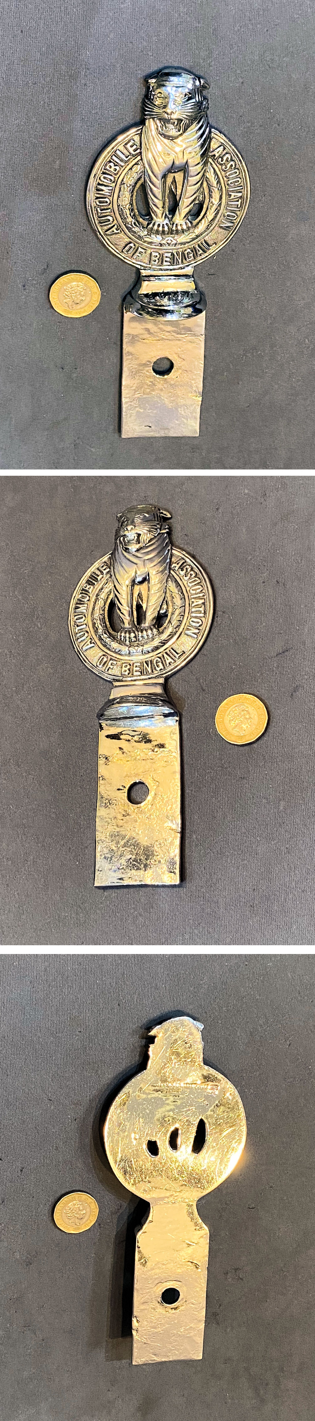 AA Bengal Car badge CB65 Original, quality 1950's chromed motor car badge with a standing tiger motive appearing through the centre with "Automobile Association of Bengal" around the outer rim. This example also has the number "8837", presumably the membership numbers. The chrome is in great condition, and all is complete and in good and working order.