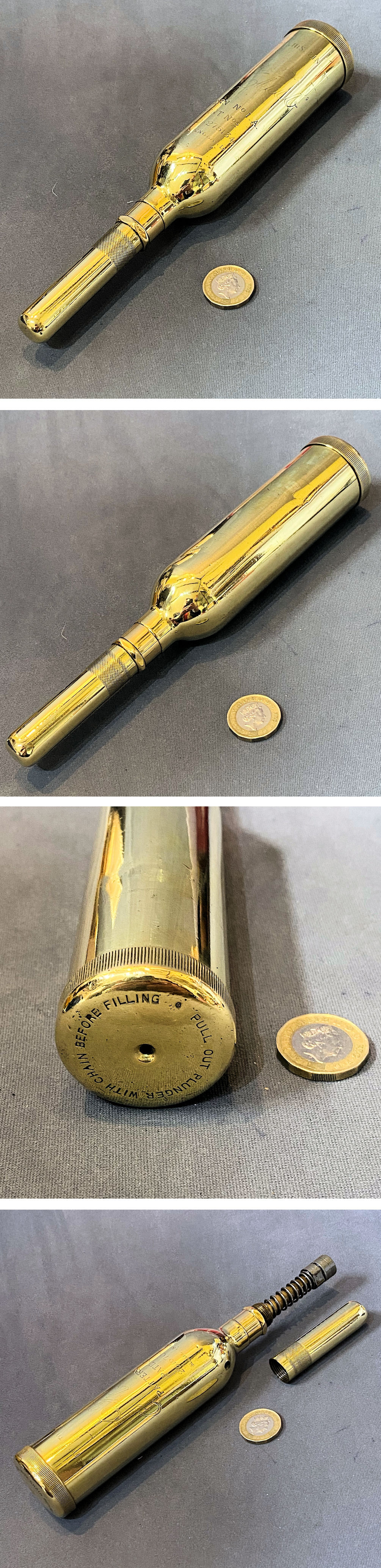 Brass Motorcycle Grease Gun OC77 Original, quality 1930's brass cylindrical shaped brass motorcycle grease gun, embossed to the shoulder for the maker "Telcalenut London" and with the registration number for the year 1930. Polished and lacquered, although the lacquer may be removed at no extra cost and complete and in good order.
