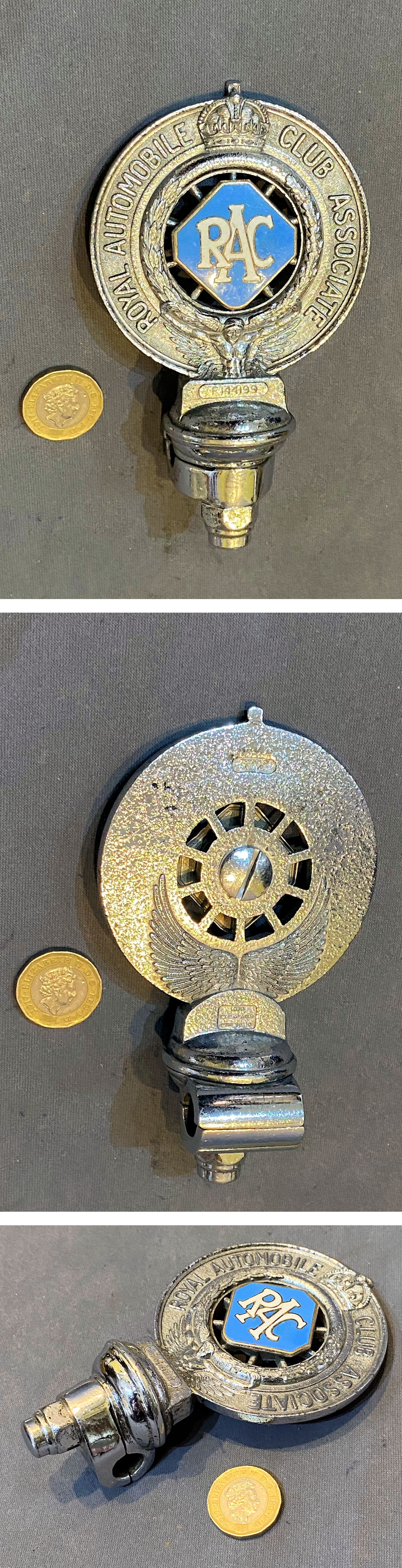 RAC Chrome Car Badge CB64 Original, quality 1930's / 40's chromed motor car badge with a bar mount. This example has the "King's Crown" to the top, an enamelled central badge detailing "RAC" and around the outer rim "Royal Automobile Club Associate". The reverse is heavily pitted but otherwise, all is complete and in good order with no chips to the enamel centre.