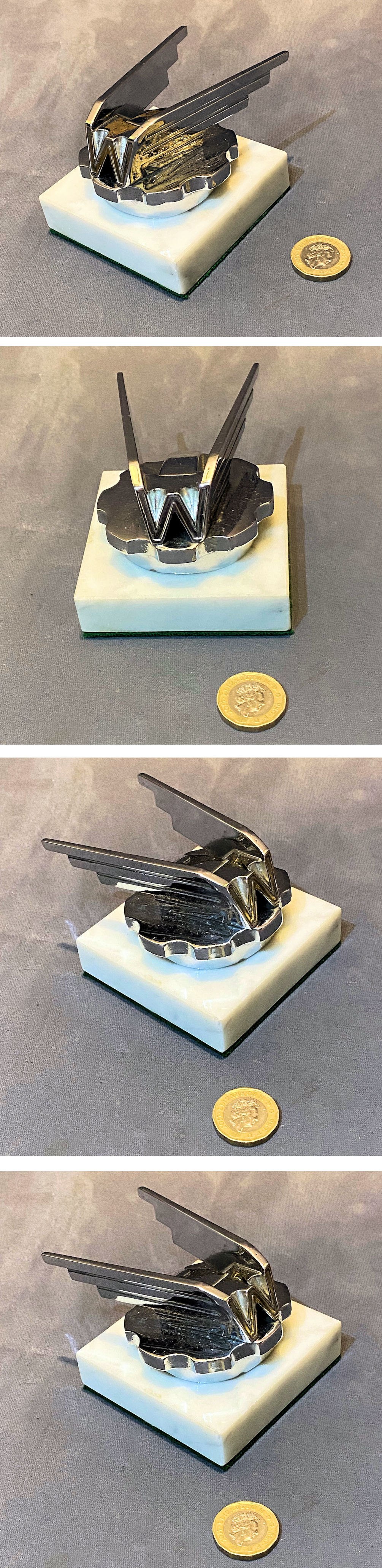 Wolseley Motor Car Mascot CM148 Original, quality chromed "W" Radiator cap mascot with the cap and later marble plinth. This model was first issued in 1939. Some minor pitting to the chrome, otherwise complete and in good order.