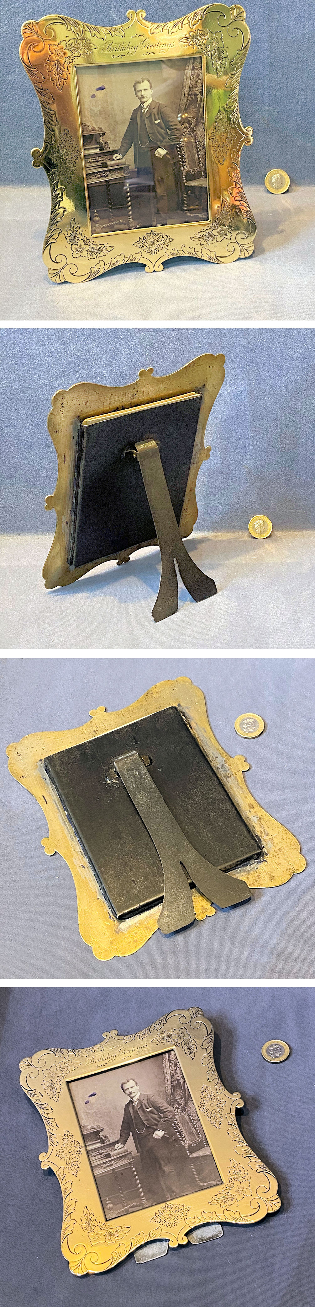 Engraved Brass Photo Frame PF167 Original, quality 1920's sheet brass photo frame with an old photograph included. This unusual example has engraved detail of mainly acanthus leaves and flowers, and at the top, "Birthday Greetings". The reverse has a replacement folding easel shaped backstand with the open top to insert the photo and glass. The brass has been polished and lacquered, although the lacquer may be removed at no extra cost, and all is complete and in good and working order.