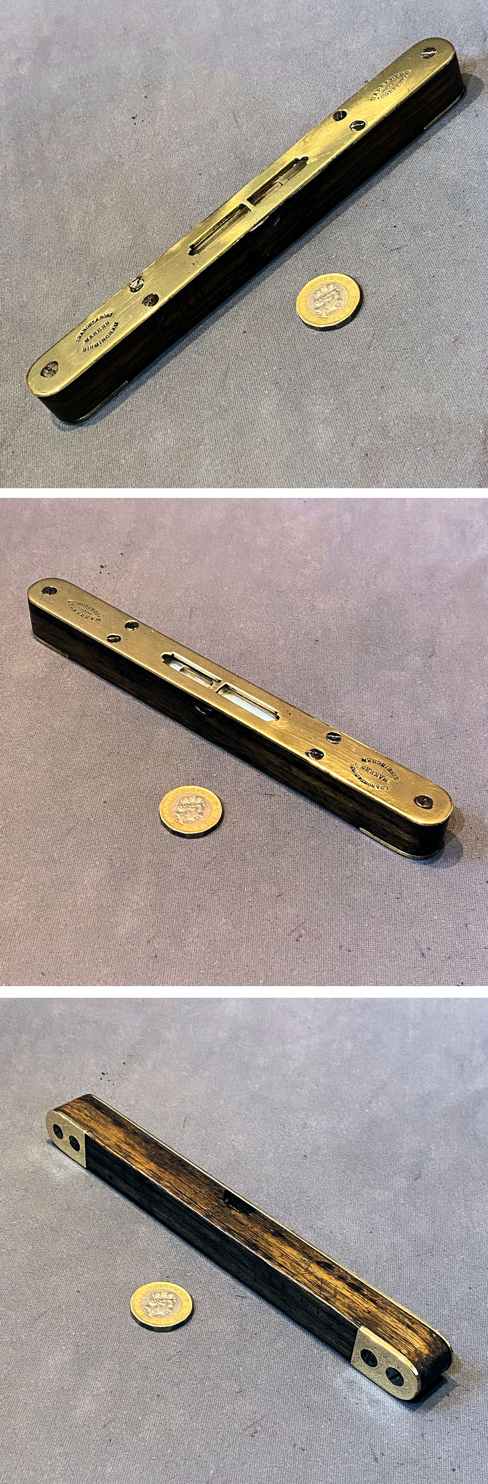 Ebony Spirit Level SL61 Original, quality, late 19th century, ebony spirit level with a brass top plate and two end plates to the underside and both a vertical level and a horizontal one. The top brass plate is engraved "Warranted Correct" and "E Preston and Sons, Birmingham, England" for the maker. The top brass plate has a decorative cut viewing panel to see the horizontal clear bubble and six steel screws. The brass has been polished and lacquered, although the lacquer may be removed at no extra cost. Complete and in good and working order.