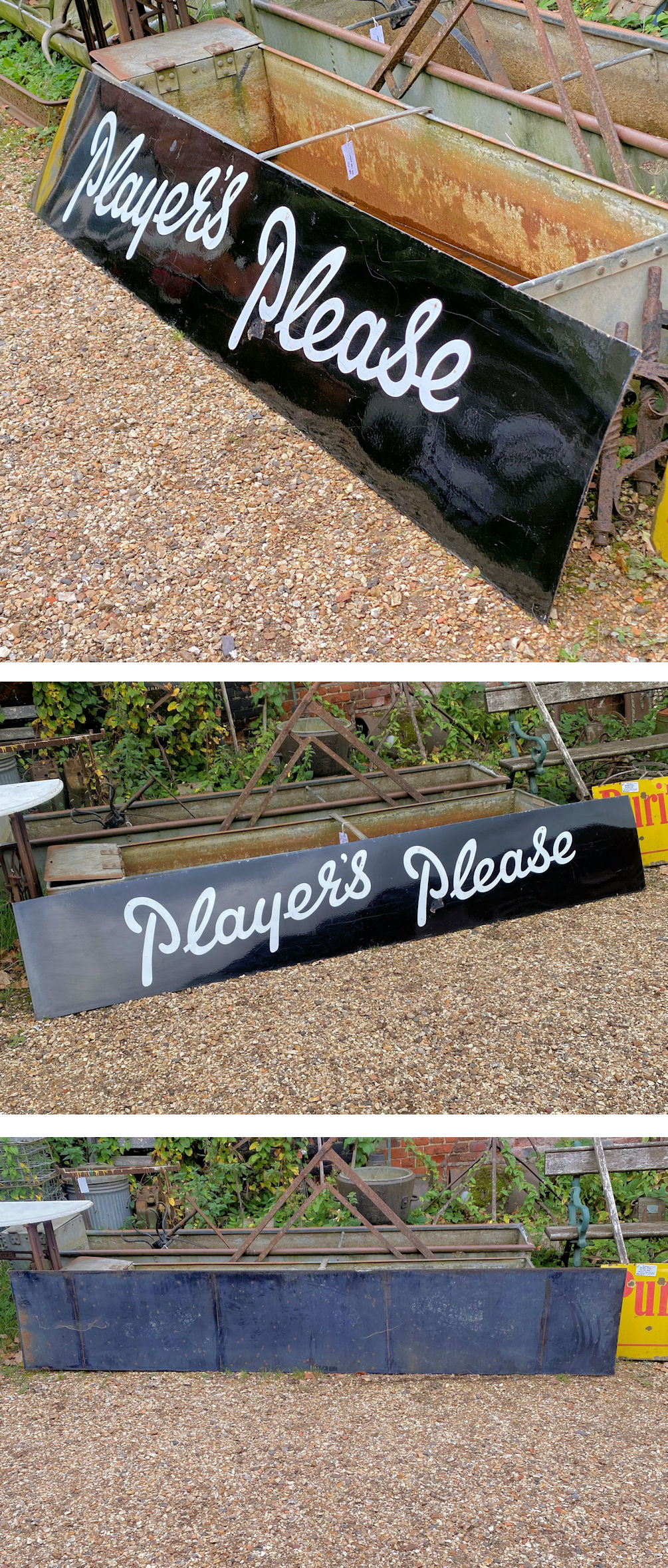 Large Players Please Enamel Sign S408 Original, quality 1920's / 30's huge enamel advert detailing "Players Please" in white on a black background in amazing condition. Minor blemishes to beneath the 'P' of please, otherwise high gloss colour. All over note this example has no holes for mounting, so probably part of the shop front or original has a wooden frame. All is complete and in good order.