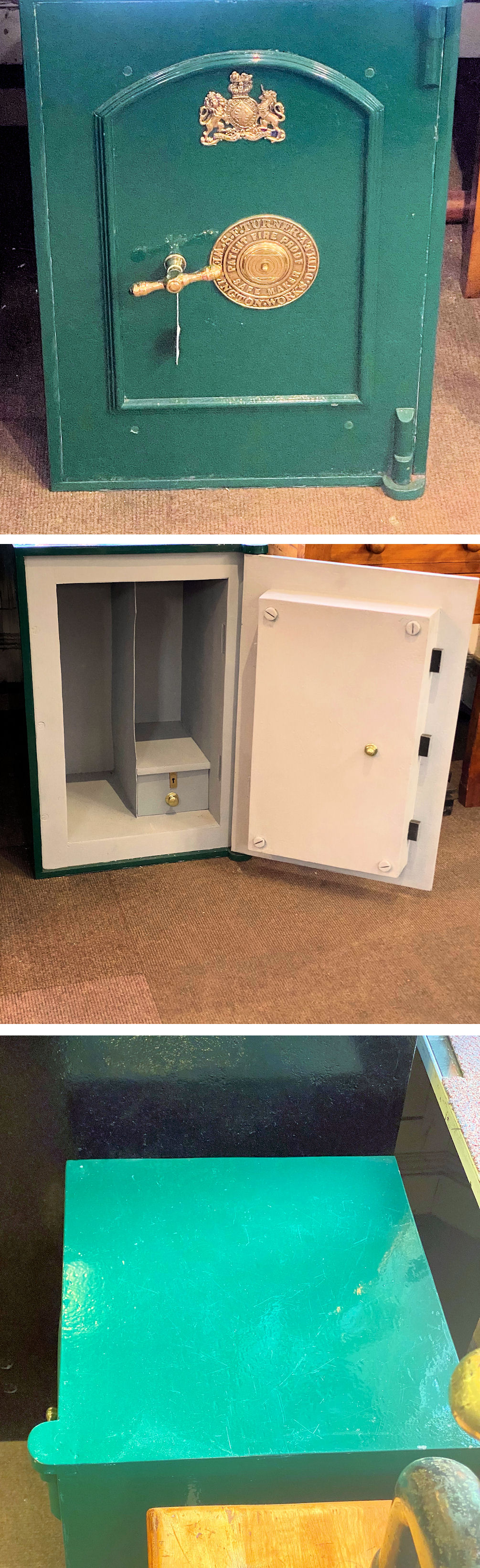 Fireproof Safe Original, quality late 19th century fireproof safe professionally sandblasted and powder coated green and the interior cold painted grey. All has been fully overhauled, the brass fittings are all original with the 'T' bar handle, a Royal Coat of Arms and an embossed surround to the keyhole with a sliding cover. The surround is detailed for the maker "S.F.Turner, Wellington Works, Dudley", "Patent Fire Proof Safe Maker". This safe comes with two keys for the door and one for the inner drawer. The brass is lacquered, although the lacquer may be removed at no extra cost and apart from a few scuffs and minor scratches. All is complete and in good and working order.