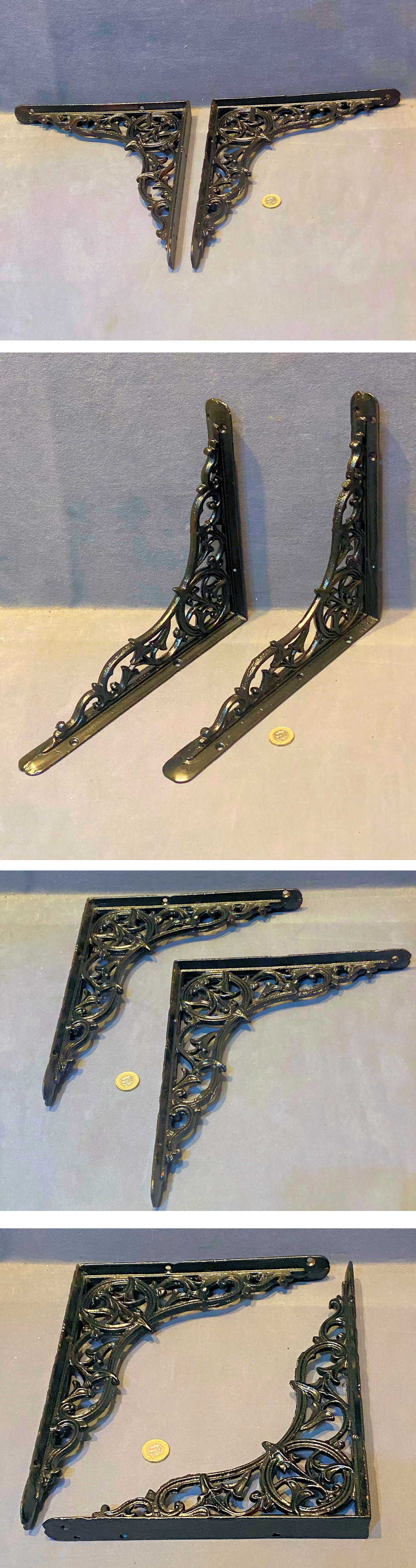 Pair of Cast Iron Shelf Brackets B147 Original, quality pair of 19th century cast iron brackets with very detailed designs of spear-headed leaves. These were probably brackets supporting a toilet seat or similar, but are perfect for shelf brackets. Some good repairs and now repainted gloss black and complete and in good and working order.