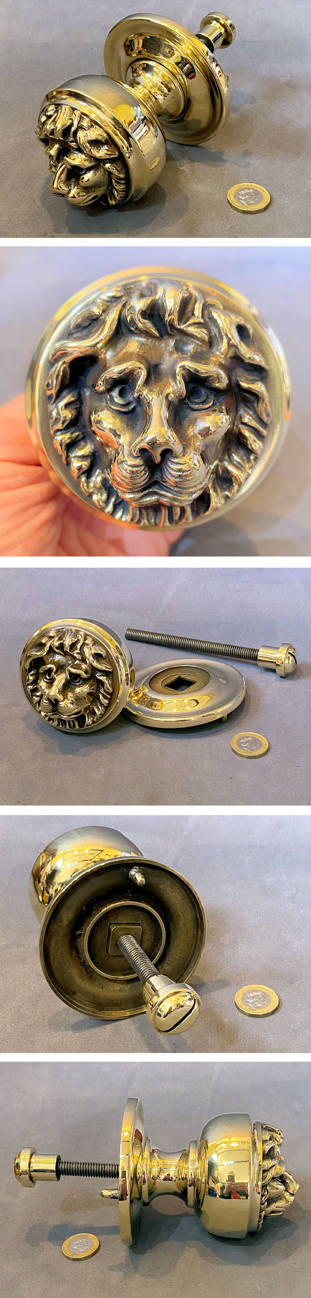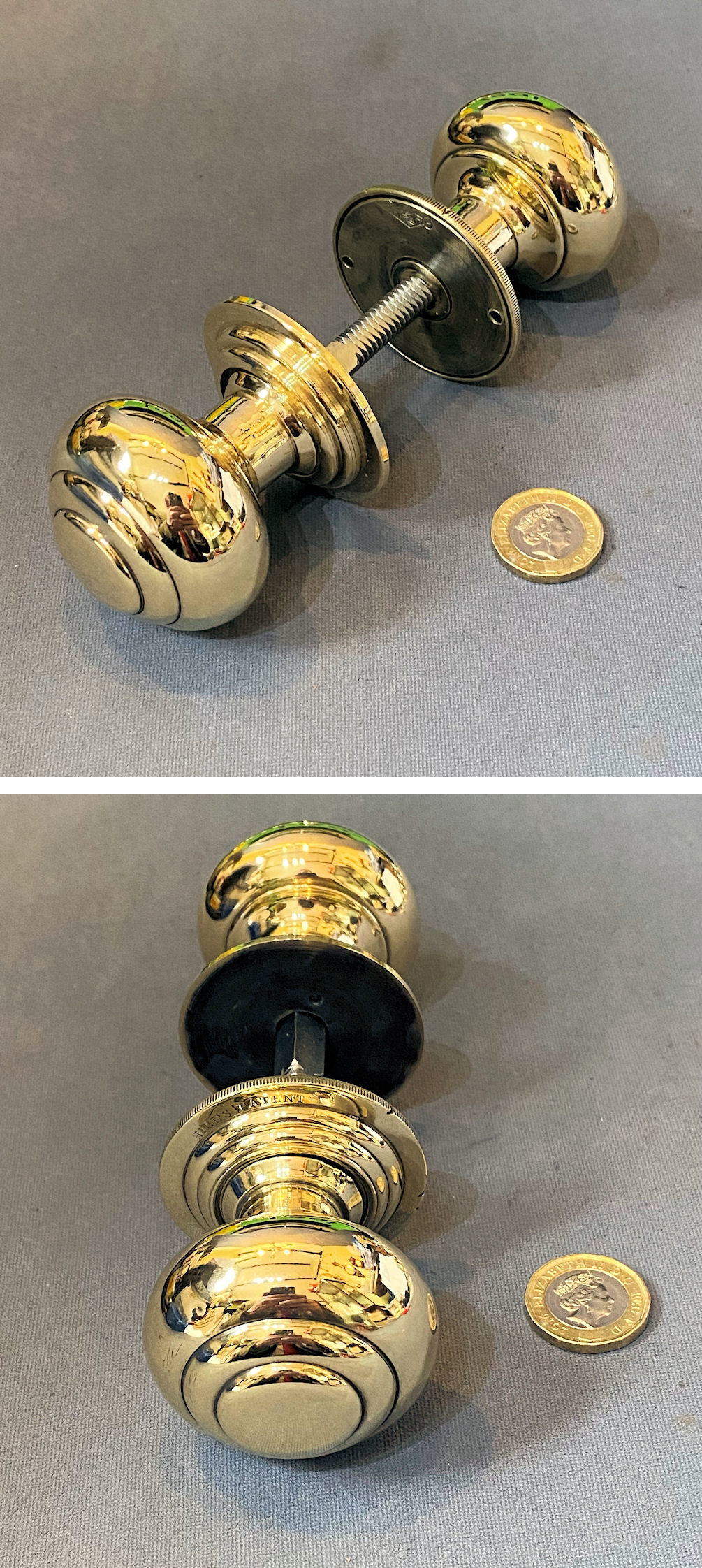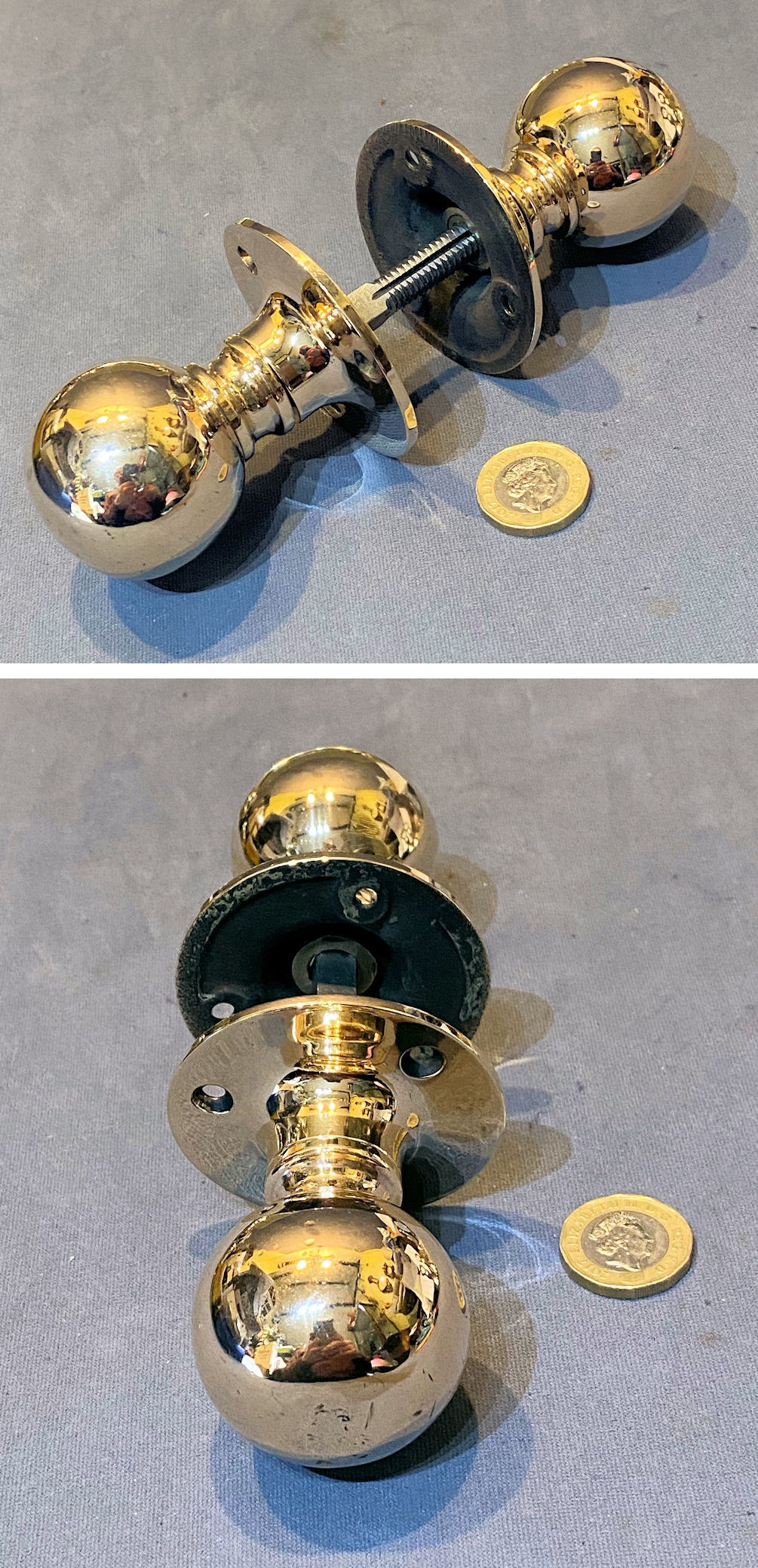 Pair of Brass Door Handles, 3 pairs available DH1149 Original, quality pair of 1920's spherical shaped brass door knobs with circular backplates and a square bar included to fit a standard mortice lock or latch. Each backplate has four countersunk screw holes for mounting and all is complete and in good and working order