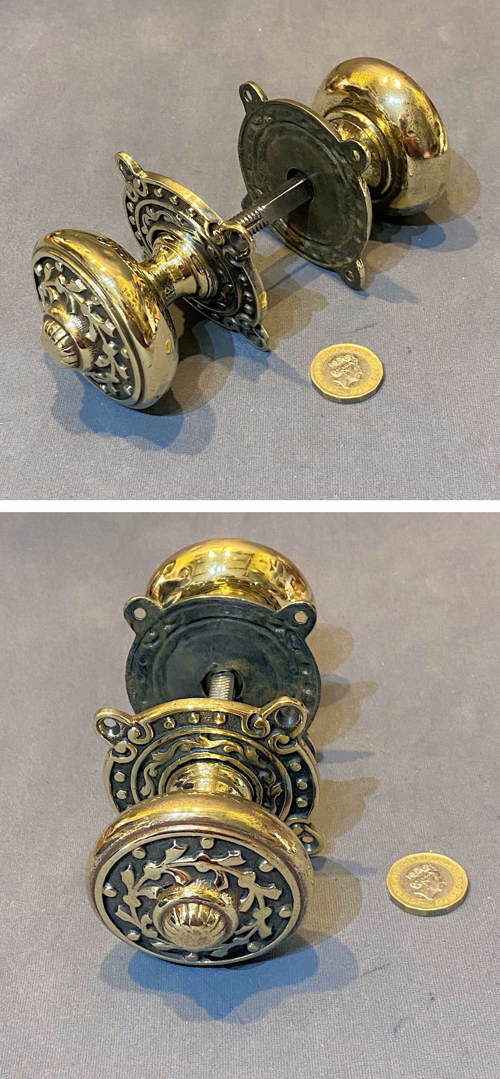 Pair of Brass Door Handles DH1170 Original, quality pair of late 19th century heavy gauge cast brass spherical shaped door handles with matching original cast brass backplates, each with four countersunk screw holes for mounting. With a threaded standard square bar and grub screw adjustment system to fit both mortice and rim locks and latches. The embossed designs include raised beads and circles of foliage surrounding the central bosses. One matching brass keyhole surround with a swinging cover may be available, ref code KC608. All fully overhauled and complete and in good and working order.