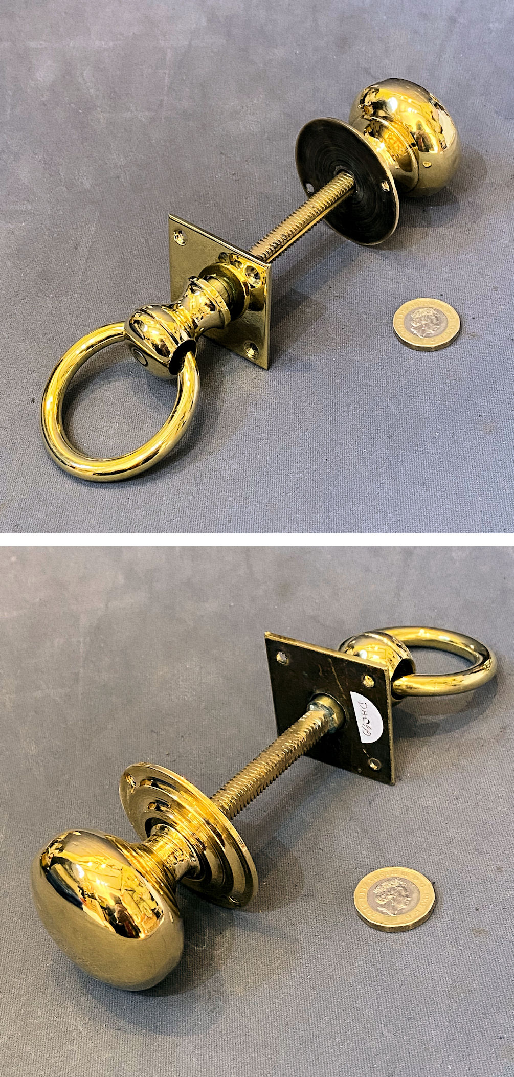 Brass Ring Door Pull DP431 Original, quality late 19th century cast brass drop ring handle originally from a strongroom door, now converted for use as a door pull or turning handle. The circular brass backplate is a replacement made to suit as is the threaded square bar which will fit a standard mortice or rim lock or latch. All is complete and in good and working order.