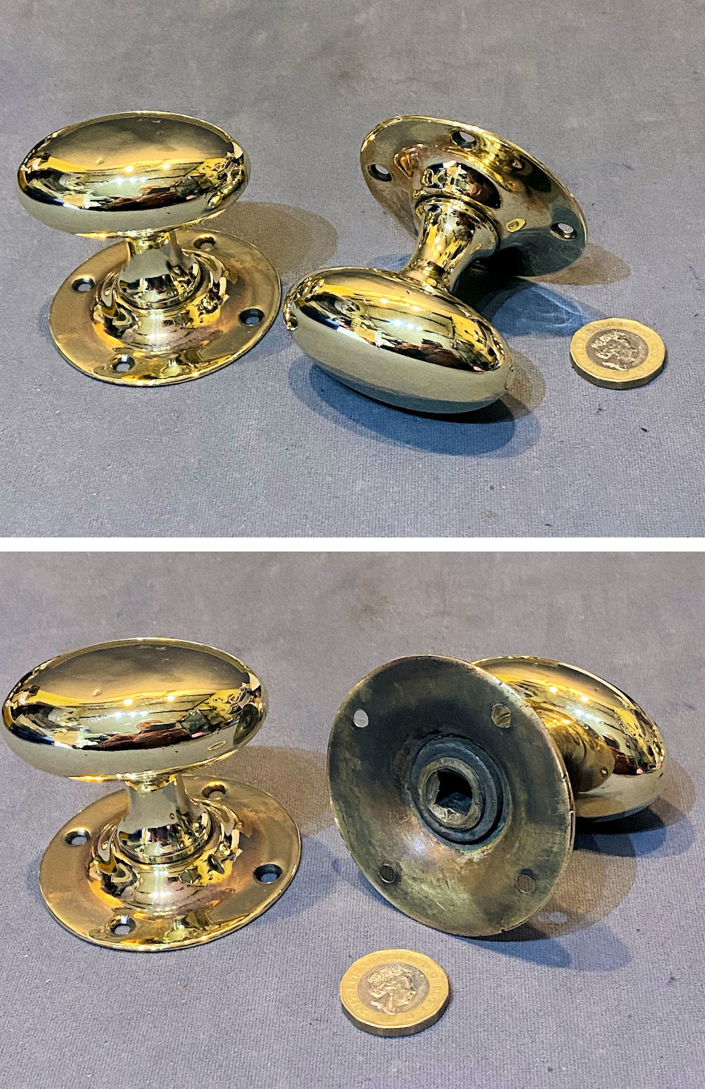Pair of Brass Oval Door Handles, 3 pairs available DH1154 Original, quality 1920's oval shaped brass door knobs with circular brass backplates, each with four countersunk screw holes for mounting and a square steel bar to fit standard mortice locks and latches. Complete and in good and working order.
