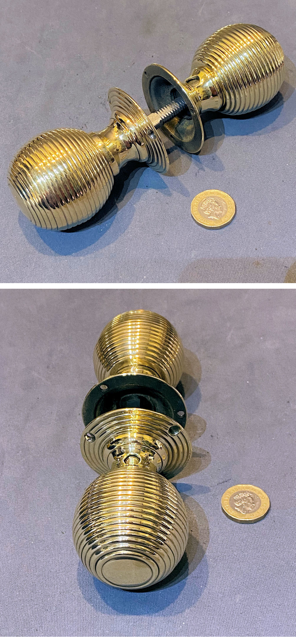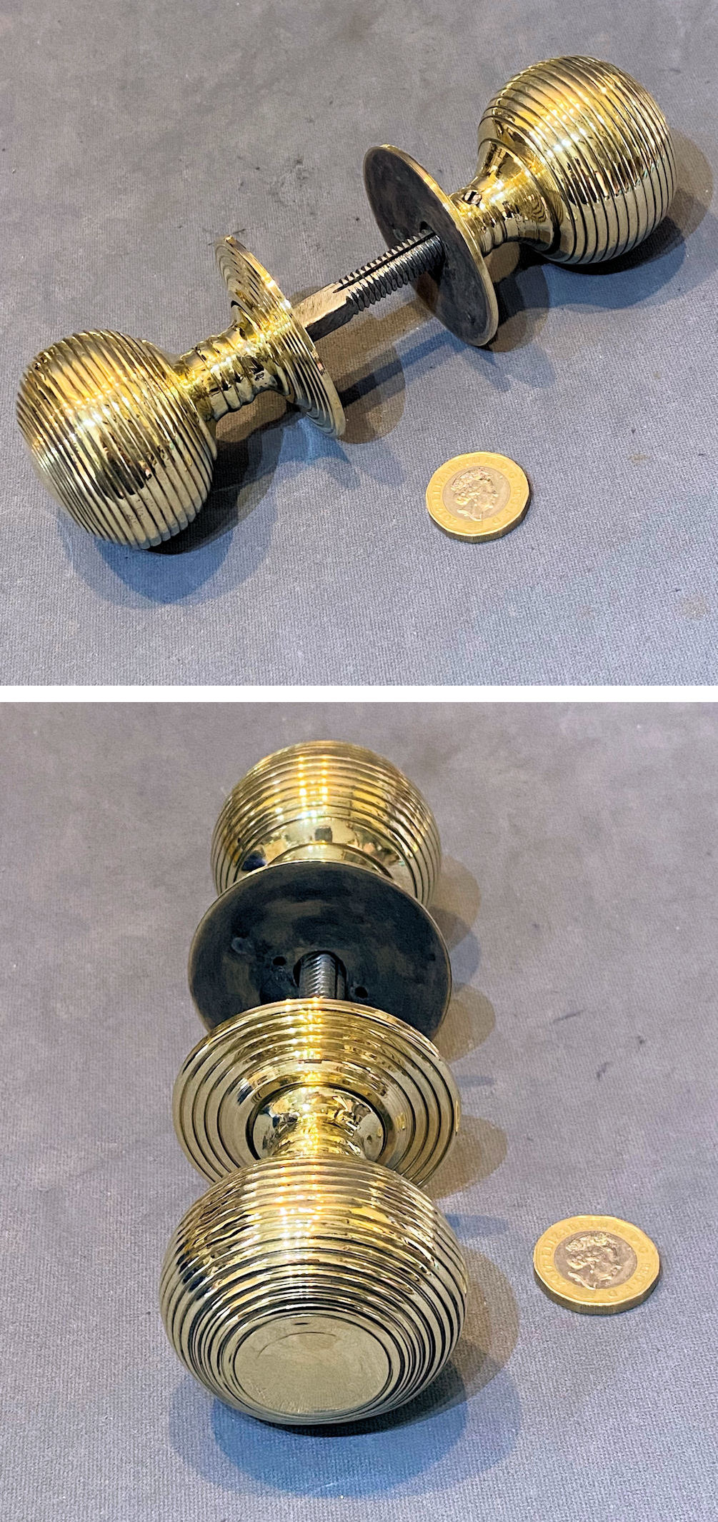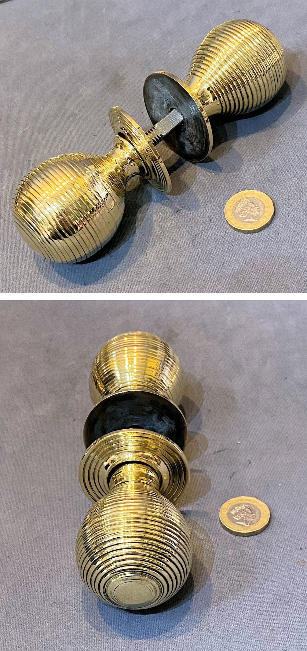Pair of Ribbed Brass Door Handles DH1176 Original, quality pair of ribbed brass spherical shaped door knobs with matching circular backplates, each with three countersunk screw holes for mounting. With a threaded standard square bar and grub screw adjustment system to fit both mortice and rim locks and latches and complete and in good and working order.