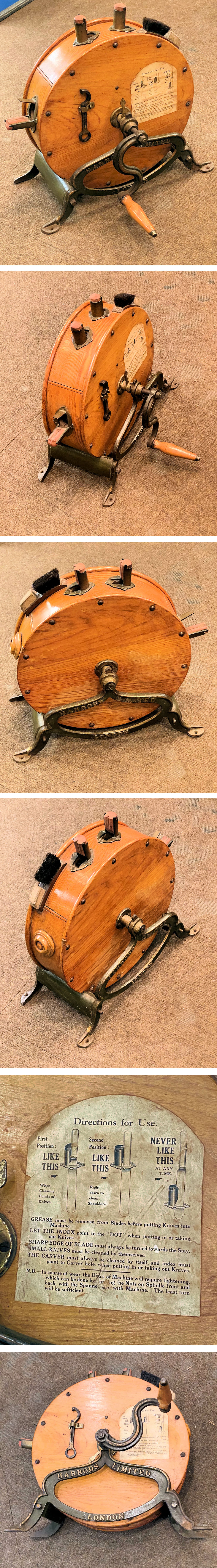 Harrods Knife Cleaner KC30 Original, quality late 19th century oak table top knife cleaner in fabulous condition. This example appears to have very little use, if any and has retained the original finish in total. The brass mounts have never been polished, the raised "Harrods Limited London" on the cast iron supports are in the original gilded finish, and the original "directions for use" label is still intact. These machines were for cleaning the old steel knives, not stainless steel and not for sharpening them. All has been fully overhauled and is complete and in good and working order.