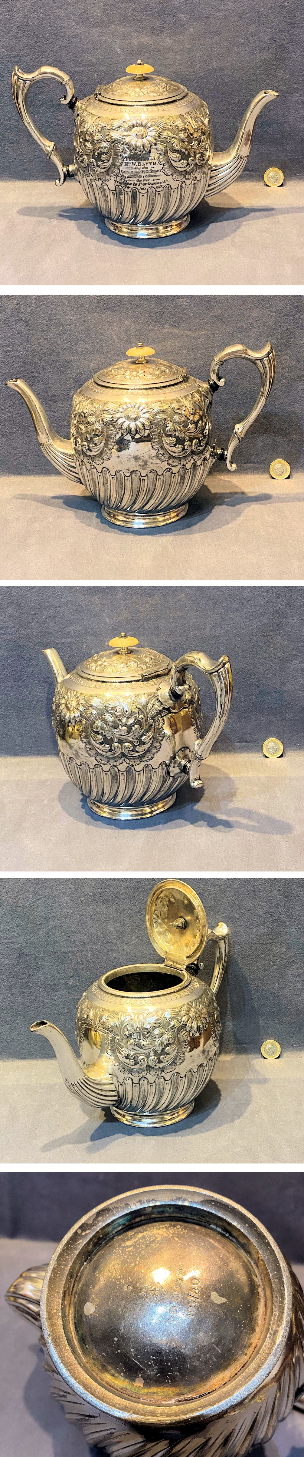 1907 Presentation Teapot P42 Original, quality Britannia Metal silver plated teapot with embossed designs of flowers to the body, black ceramic heat protector rings to the handle, and a Mother of Pearl knob to the lid. The front panel is engraved "Presented to Mr W. Blyth by the Gosport P.O. Staff, as a mark of esteem on his transfer to Portsmouth, 1st July 1907". Some old minor repairs, otherwise complete and in good and working order.