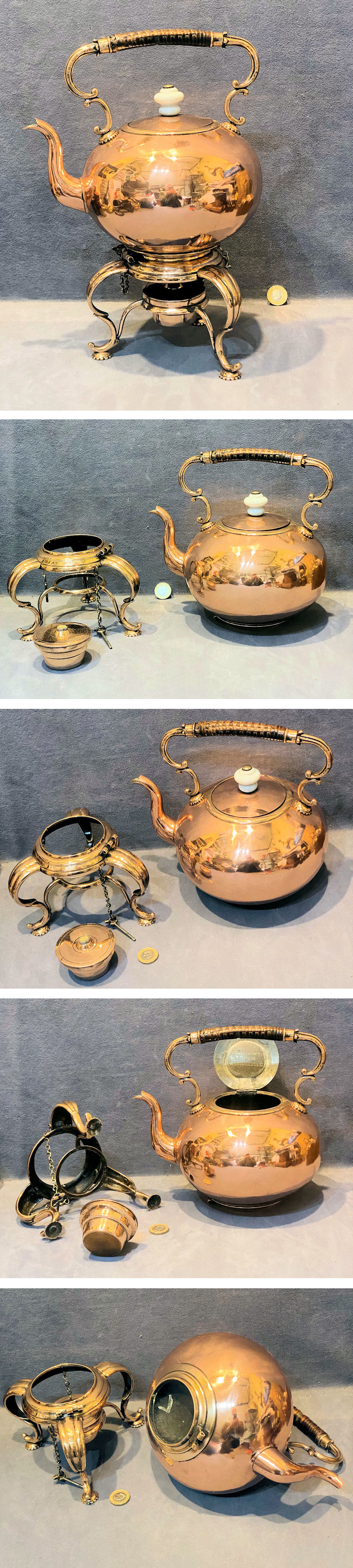 Copper Spirit Kettle on Stand K210 Original, quality mid to late 19th century copper kettle on a tripod stand fitted with a burner to the centre to be used with methylated spirits. This example has a woven cane handle, a white ceramic knob to the lid and is impressed to the inside of the lid "Warranted Best London Manufacturer". The kettle is locked onto the stand with two pins. 1. Take out the back pin; this will permit the kettle to be tilted for pouring. 2. Take out the front pin and the back one, and the kettle will lift off for filling. The burner does have a wick, and all is in super condition and complete and in good and working order. All has been polished and lacquered, although the lacquer may be removed at no extra cost. An unusual model.