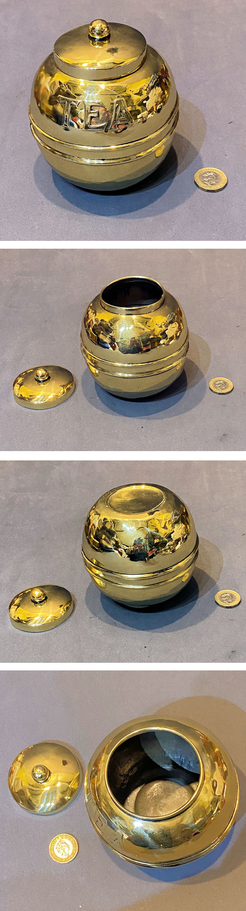 Brass Tea Caddy TC40 Original, quality 1920's spherical shaped pressed brass tea caddy with the original lid and embossed to the shoulder "Tea" in upper cased text. The interior is tinned, and the outer has been polished and lacquered, although the lacquer may be removed at no extra cost. All is complete and in good and working order.