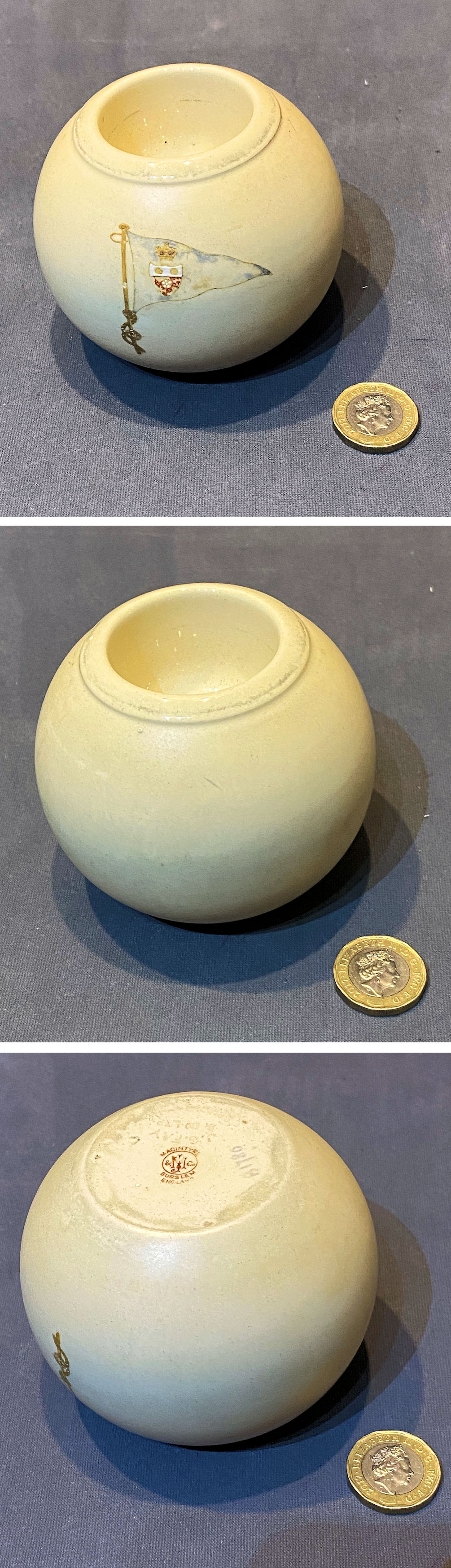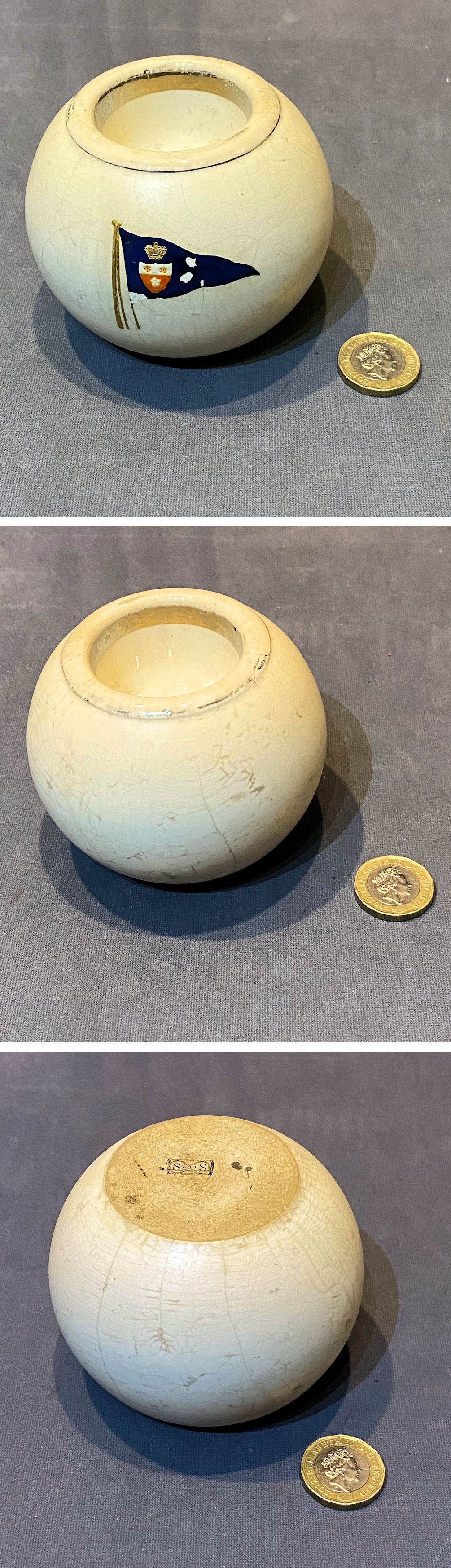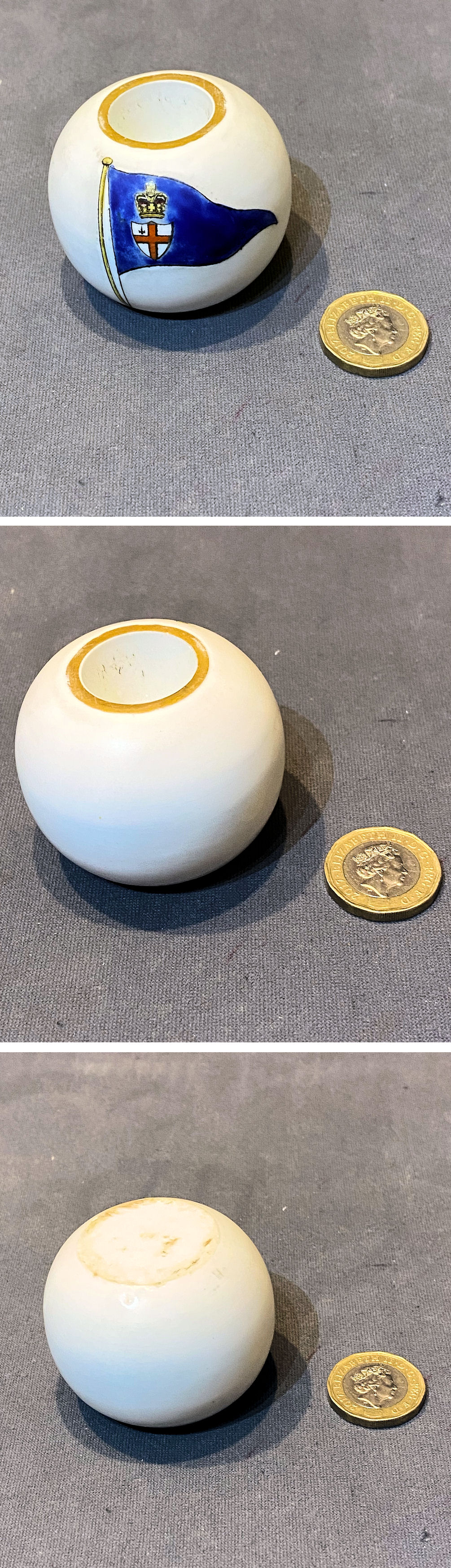 Match Holder with Burgee Logo MS73 Original, quality 1920's spherical shaped, white ceramic match holder decorated to the front with a pennant-shaped yacht club burgee. This example has a shield shaped device with a crown over it on a Royal blue background, and the underside has detail for the maker. Complete and in good order.