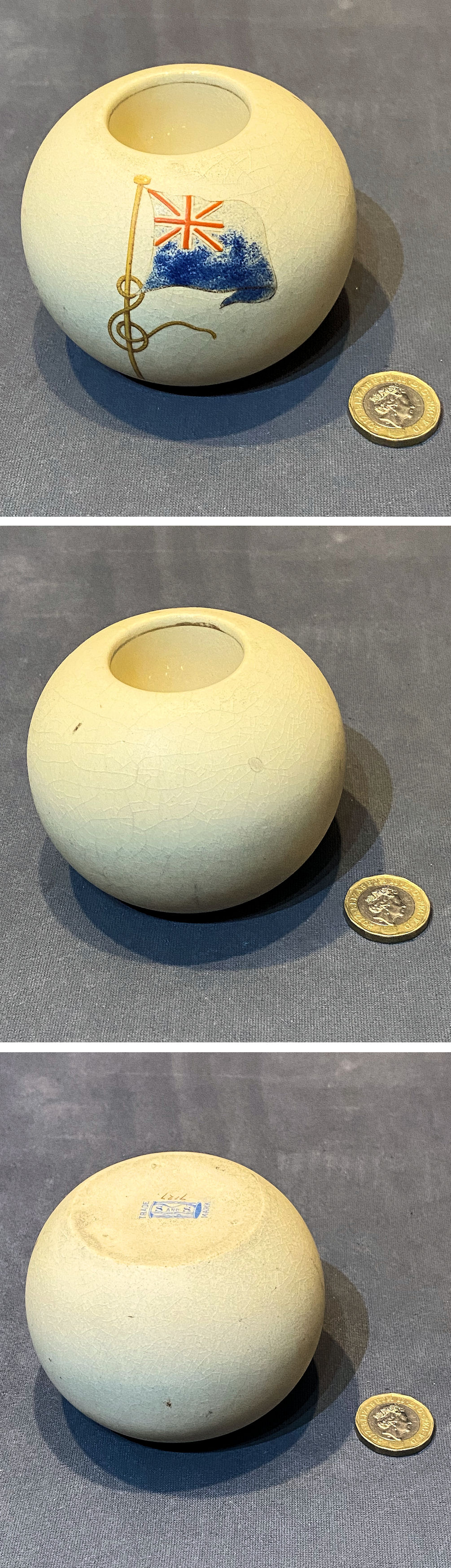 Match Holder with Burgee Logo MS75 Original, quality 1920's spherical shaped, white ceramic match holder decorated to the front with a pennant shaped yacht club burgee. This example has a Union flag to the top left side on a Royal Blue background, and the underside has the manufacturer details. The blue colour has partially faded, otherwise all is complete and in good order.