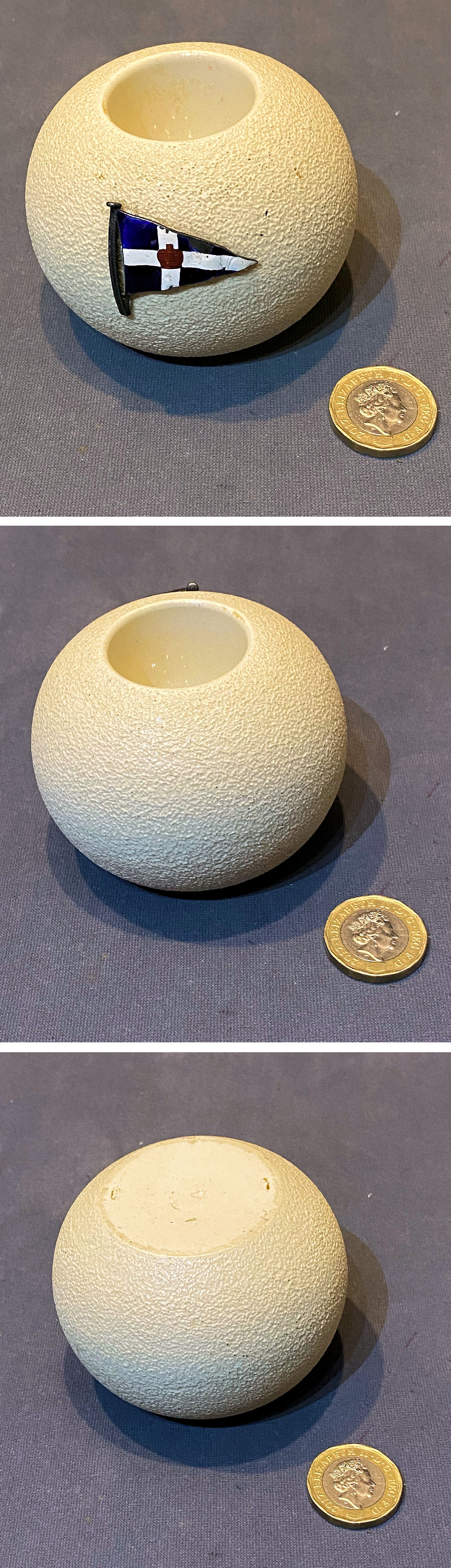 Match Holder with Burgee Logo MS77 Original, quality 1920's spherical shaped white ceramic match holder with a textured outer surface and an enamelled metal pennant shaped yacht club burgee with a white cross on a Royal Blue background with a red crown. One chip to the enamel, otherwise complete and in good order.