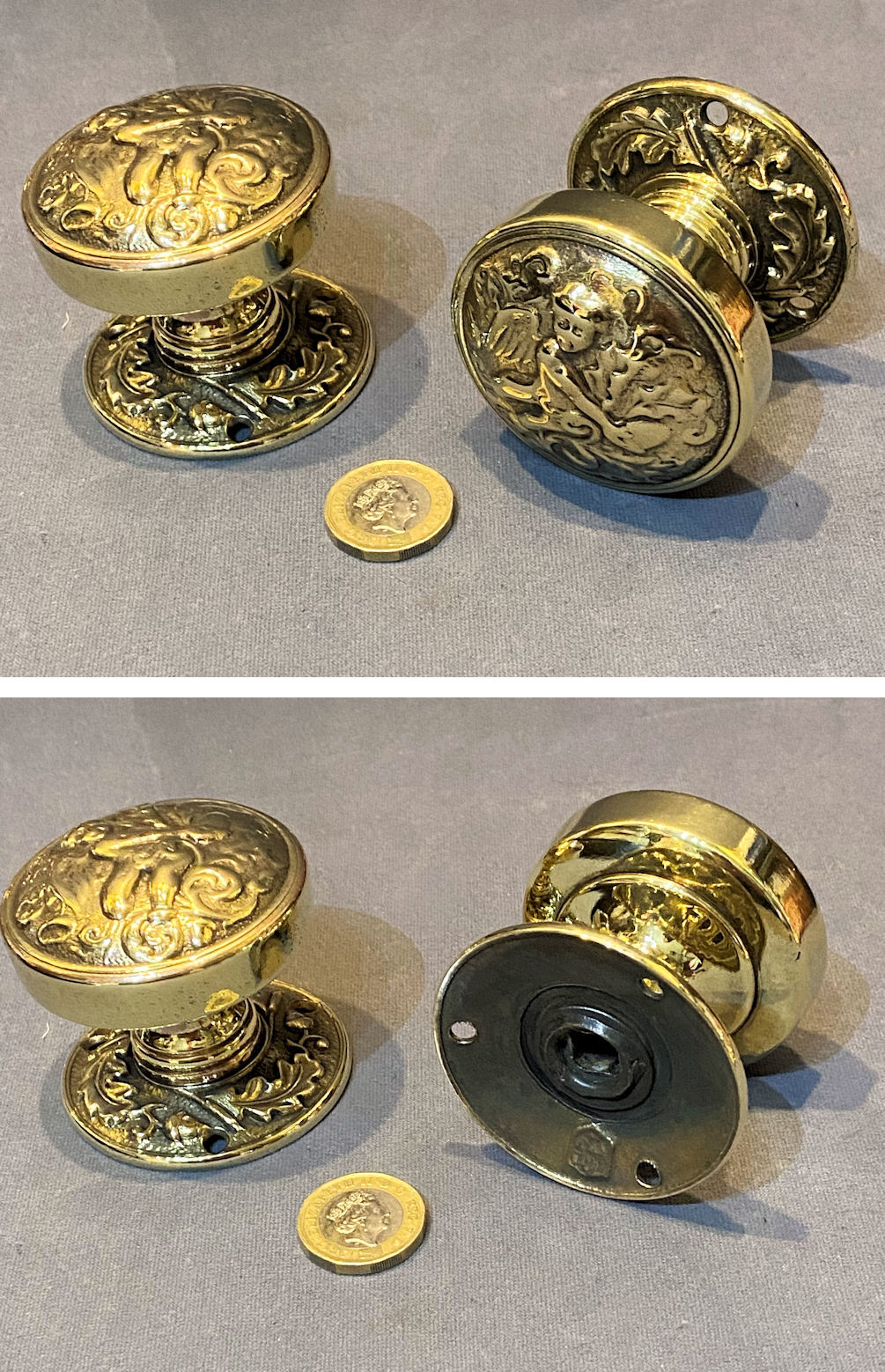 Pair of Cherb Brass Door Handles DH1160 Original, quality pair of late 19th century circular brass door knobs with cushioned fronts with an embossed design of a cherub holding a huge acorn the circular backplates, each have three screw holes for mounting. A square bar is included to fit standard mortice locks and latches. A most unusual design, the first we have seen and complete and in good and working order.