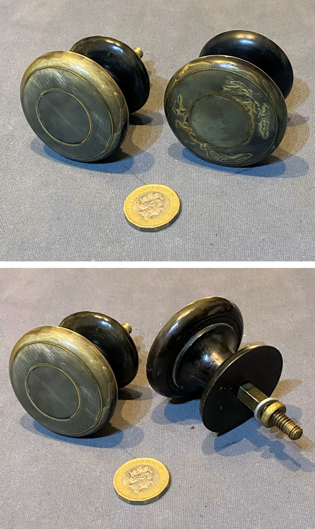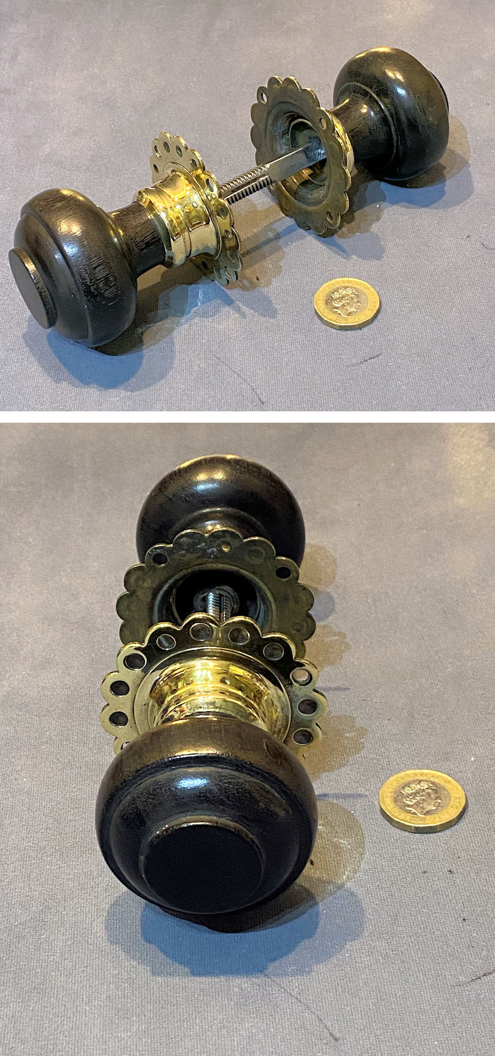 Pair of Ebony & Brass Door Handles, 6 pairs available DH1162 Original, quality pair of spherical shaped turned ebony door knobs with fancy brass petal shaped backplates, each with four screw holes for mounting. With a threaded standard square bar and grub screw adjustment system to fit both mortice and rim locks and latches. Complete and in good and working order.