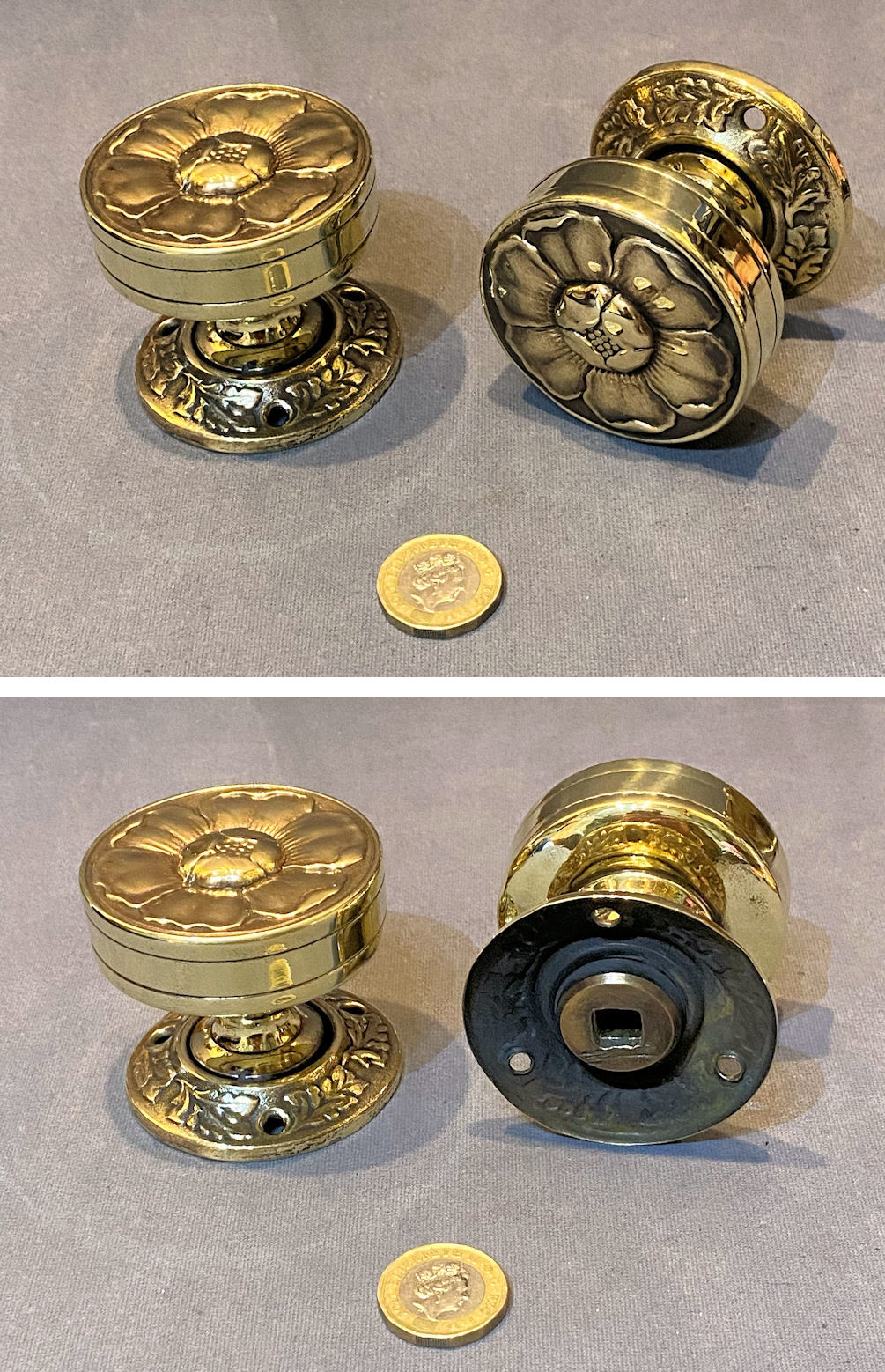Pair of Tudor Rose Brass Door Handles DH1161 Original, quality pair of late 19th century circular brass door knobs with flat fronts, with a Tudor rose embossed detail. The circular backplates each have embossed detail of oak leaves and three screw holes for mounting. The first time we have seen off this design. a square bar is included to fit standard mortice locks and latches and all are complete and in good and working order.