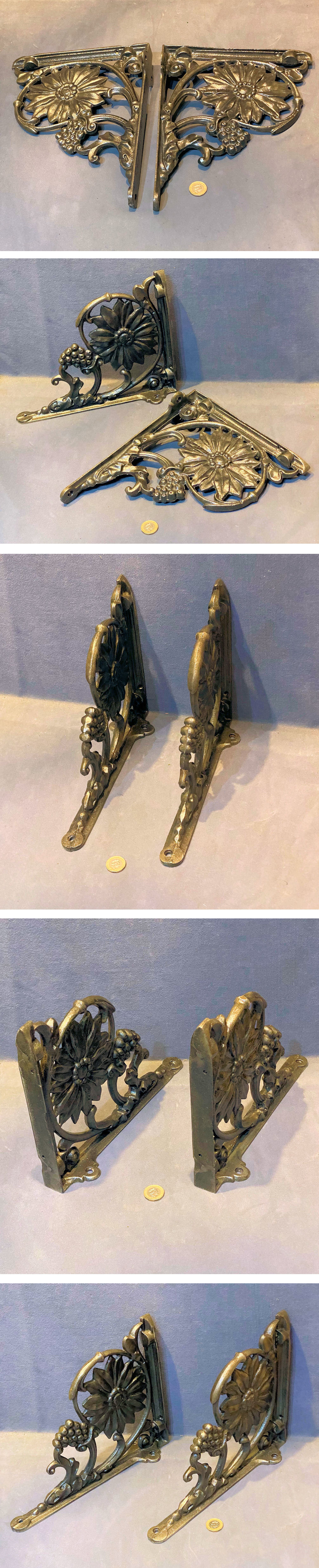 Pair of Cast Iron Shelf Brackets B148 Original, quality pair of late 19th century cast iron wall brackets originally from a wall mounted wash basin stand. These superb brackets are ideal for shelf supports, and each has three countersunk screw holes for mounting to the wall and two fresh countersunk screw holes to fix the shelf if required. The very detailed design is of a sunflower head with a seed pod, and acanthus leaves, with no "79" for the model and the registration number for the year 1893. All has been cleaned and lacquered and is complete and in good and working order.