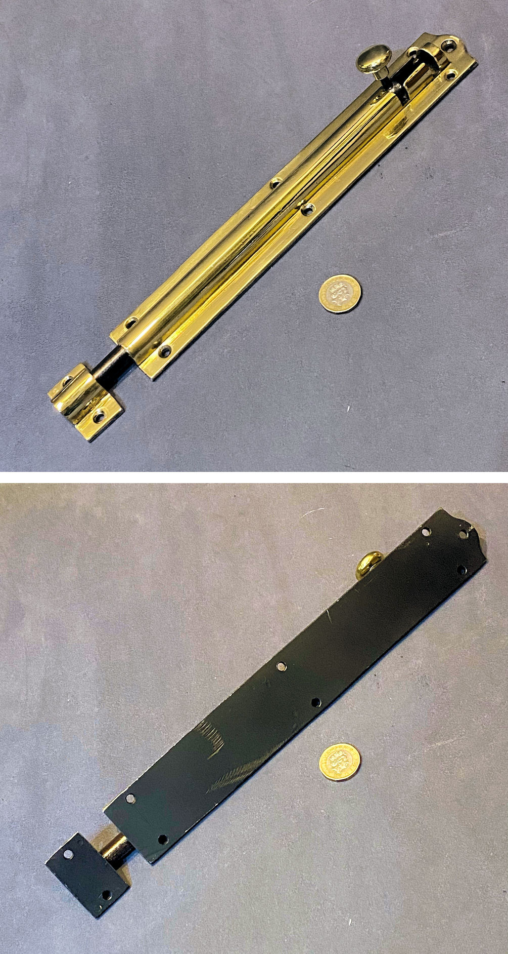 11" Brass Door Bolt DB542 Original, quality late 19th century heavy grade cast pink brass 11" surface mounted door bolt with a replacement keep made to suit. The bolt backplate has six countersunk screw holes for mounting and the keep has two. The bar has a good shaped finial grip. Fully overhauled, polished and lacquered, although the lacquer may be removed at no extra cost and complete and in good and working order.