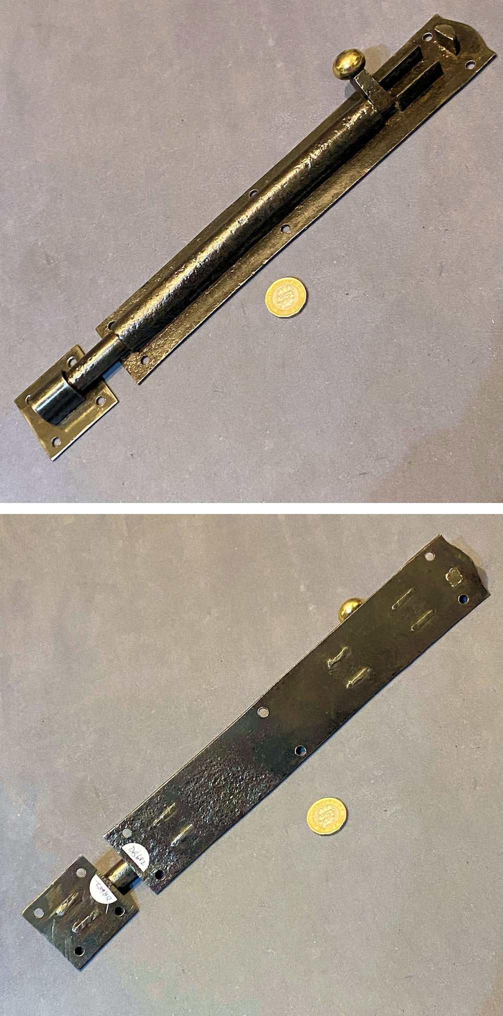 12" Wrought Iron Door Bolt DB666 Original, quality 18th or early 19th century blacksmith made wrought iron surface mounted door bolt with a brass finial / grip and two differing wrought iron keeps made to suit. The backplate to the bolt has six screw holes for mounting and the keeps have four and two. All has been cleaned and lacquered, although the lacquer may be removed at no extra cost and is complete and in good and working order.