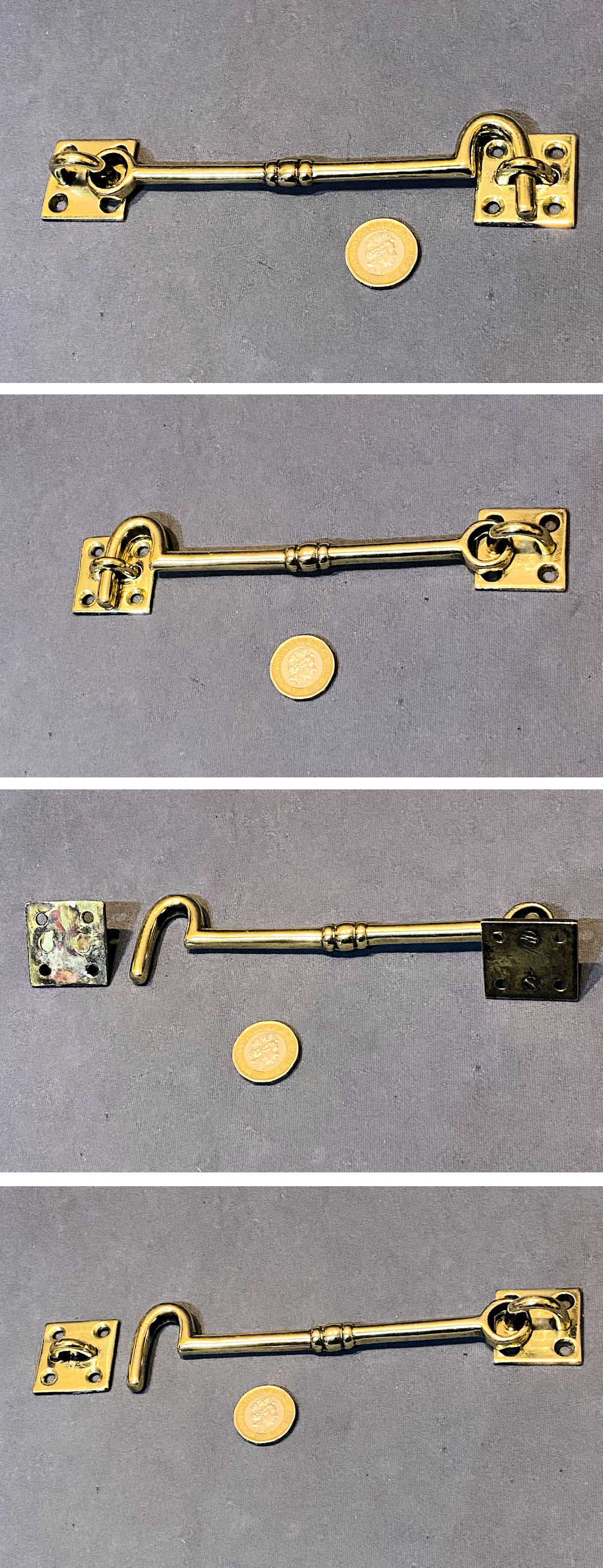 5.75" Brass Door Hook & Eye DH67 Original, quality late 19th century cast brass 5.75" door hook with a replacement brass keep made to suit. The square brass backplates each have four countersunk screw holes for mounting. All has been polished and lacquered, although the lacquer may be removed at no extra cost and is complete and in good and working order.