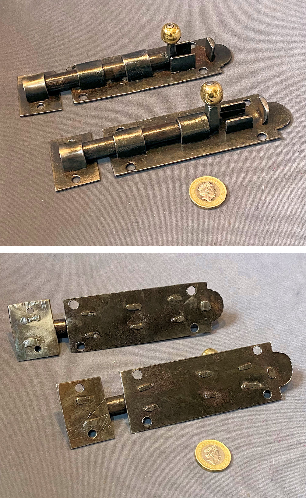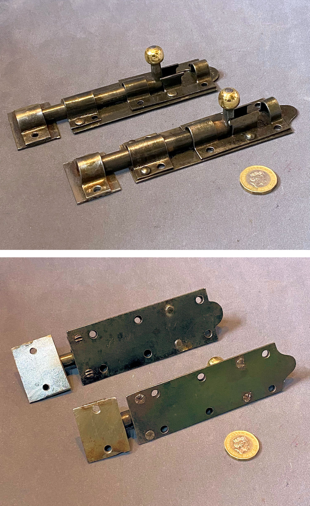 Pair of 5" Wrought Iron Door Bolts DB687 Original, quality pair of late 19th century 5" surface mounted wrought iron door bolts with brass finial grips and replacement keeps made to suit. The bolt backplate has four screw holes for mounting and the keep has two. All has been cleaned and lacquered and is complete and in good and working order.