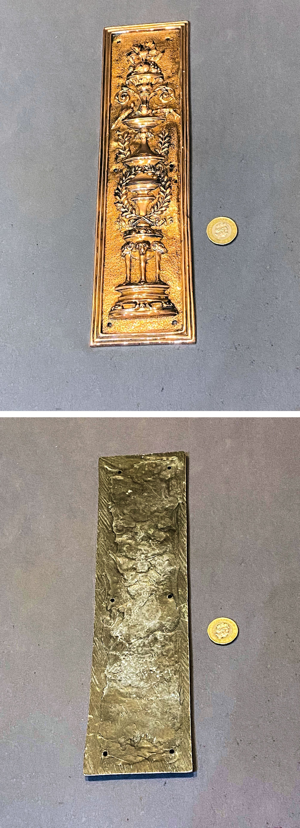Embossed Copper Fingerplate FP590 Original, quality late 19th century copper door fingerplate with a very detailed embossed design of classical urns filled with fruit and laurel leaf branches. This super example has six screw holes for mounting, and the reverse has been filled with lead as a support for the embossed design. All has been polished and lacquered, although the lacquer may be removed at no extra cost and is complete and in good and working order. The first we have seen.