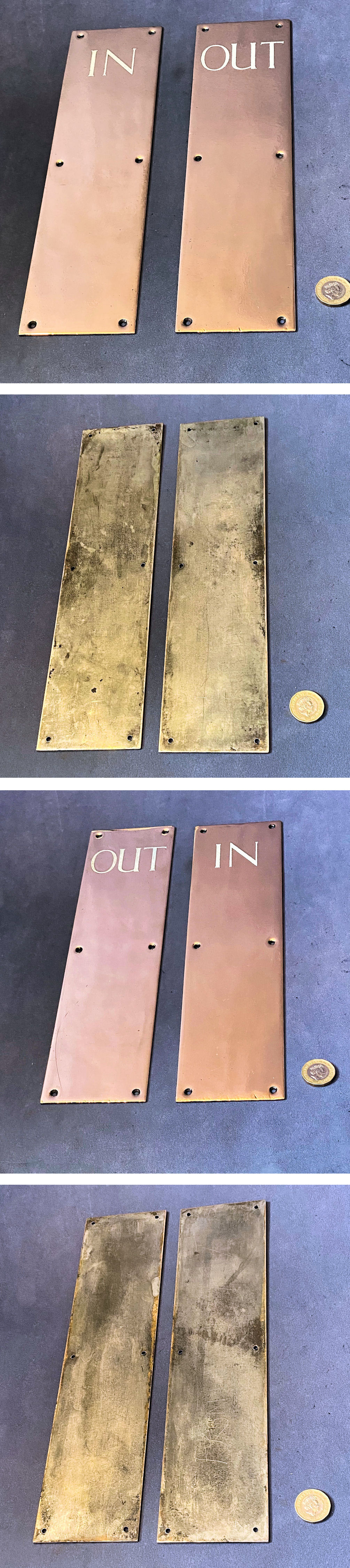 Pair of In & Out Brass Fingerplates, 2 pairs available FP591 Original, quality late 19th century cast pink brass rectangular shaped vertical fingerplates with inlaid white enamel in tall upper cased letters "IN" and "OUT". No damage to the enamel and each plate has six countersunk screw holes for mounting. Some minor scratches, all are complete and in good and working order otherwise have been lacquered, although the lacquer may be removed at no extra cost. One pair = A and one pair = B.