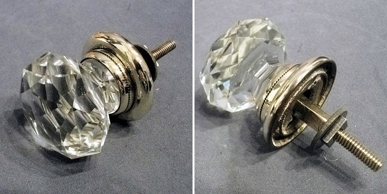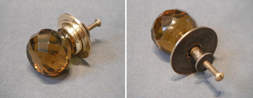 Single Cut Glass Cupboard Knob CK173 Original, quality, superb, late 19th Century, clean cut, glass cupboard door knob with a brass collar and backplate, and a threaded bar with a nut and washer. The backplate has two countersunk screw holes for mounting, all has been lacquered and is complete and in good and working order. The lacquer can be removed upon request, at no extra cost.