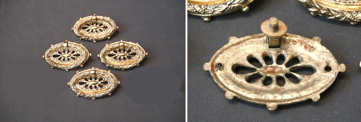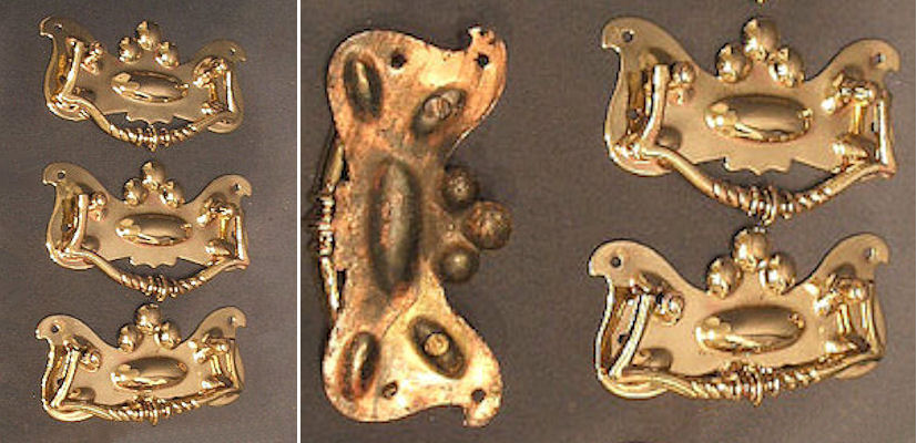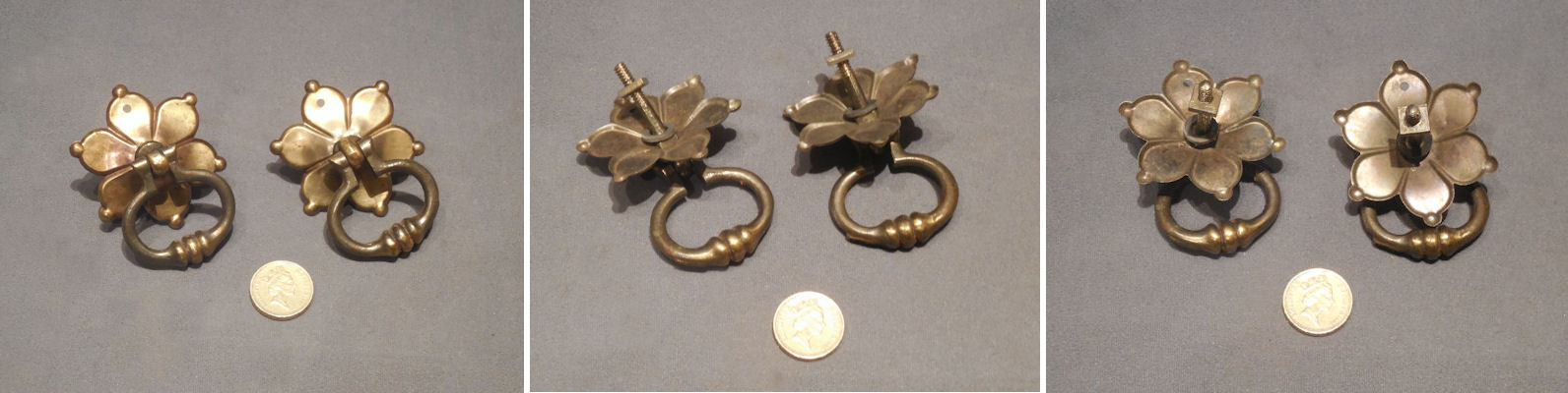 Brass Drawer Handles, 3 available CK62 Original quality brass cabinet drawer handle with a pressed brass backplate and a cast brass drop handle, all in the Art Nouveau style. The registration number for the year 1902 is impressed to the reverse.