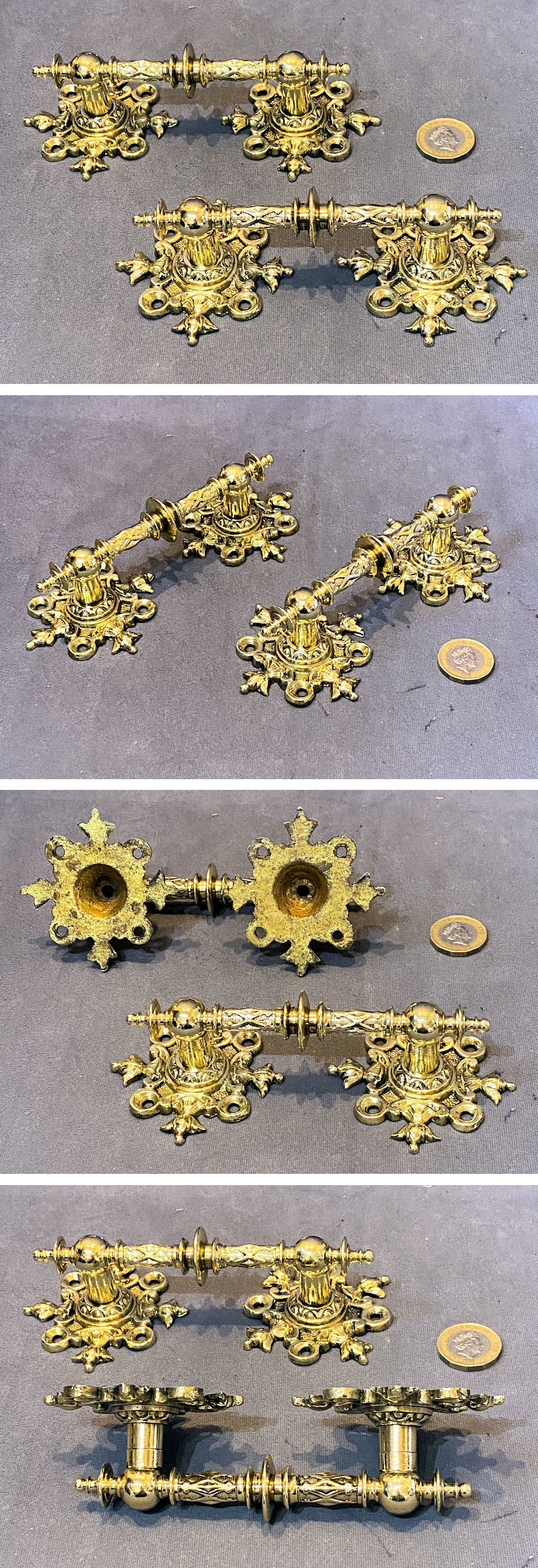 Pair of Brass Door / Drawer Pulls DP646 Original, quality pair of late 19th century, very decorative cast brass, piano lifting handles. One deal for use as door or drawer pulls. The very detailed backplates each have four countersunk screw holes for mounting, and all have been polished and lacquered, although the lacquer may be removed at no extra cost. Probably continental. Complete and in good and working order.