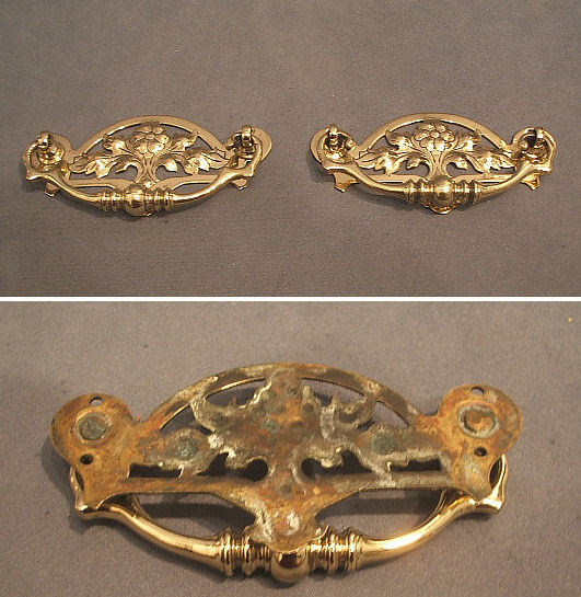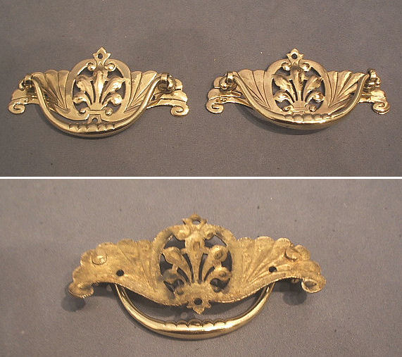 Pair of Brass Drawer Handles CK116 Pair of original, quality, brass drawer pulls with fretted and engraved sheet brass backplates and cast brass drop handles. The backplate have a design of leaves and flowers and bear the registration number impressed for the year 1889. All has been polished and lacquered and are complete and in good and working order.