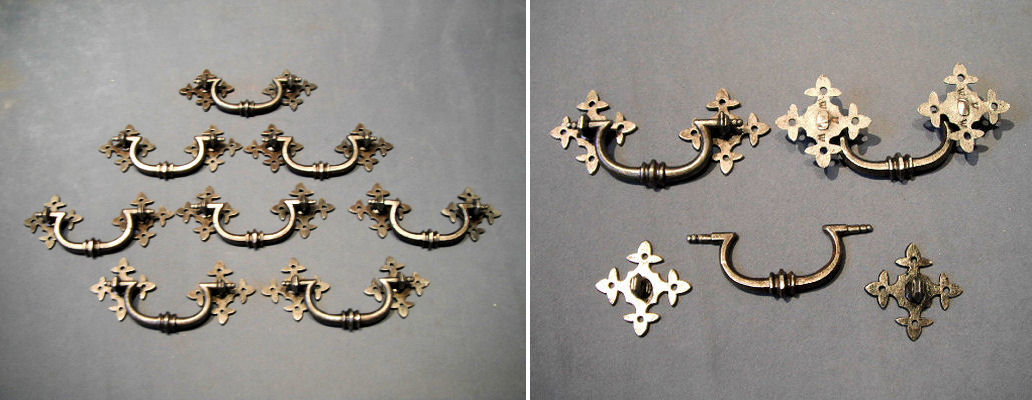 Set of 8 Cast Iron Drawer Pulls CK179 Original, quality, 1920's, set of eight matching, superb, cast iron, 'Gothic' style drawer pull handles. Each star shaped backplate has four screw holes for mounting and the central drop handle is retained in the side within an eye on each backplate. All have been cleaned and lacquered and are complete and in good and working order. A superb set of handles for a chest of drawers or for kitchen units.