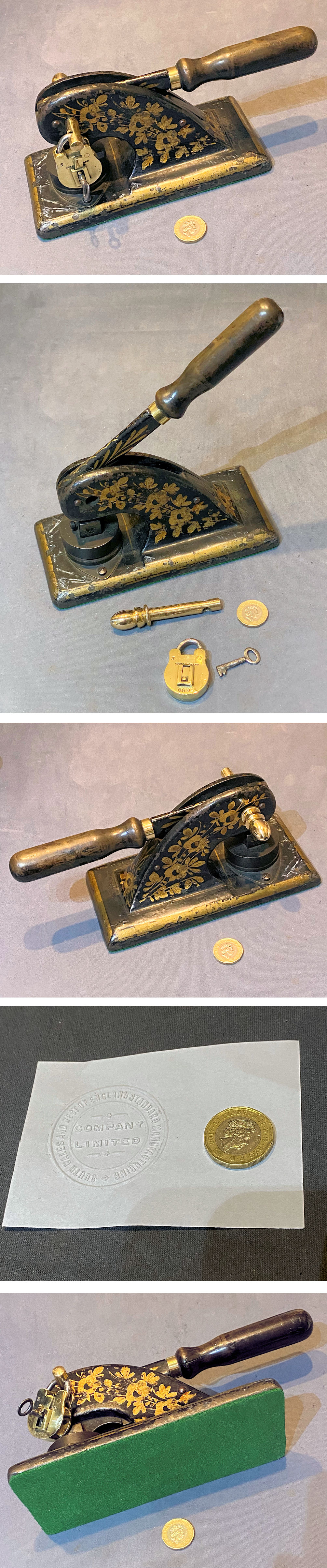 Cast Iron Letter Embosser LE19 Original, quality circa 1900 / 1920's cast iron letter embosser with the original paintwork and decoration. This example was used for business documents and is fitted with a brass padlock and a brass locking bar with an acorn shaped finial and a key. The brass has been polished and lacquered, although the lacquer may be removed at no extra cost and all is complete and in good and working order.