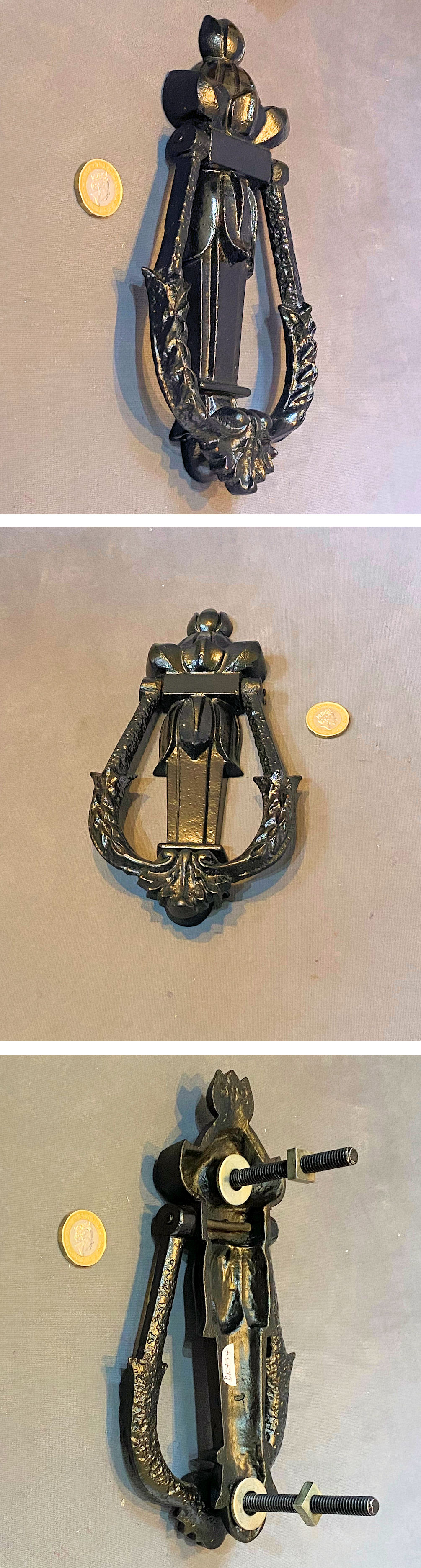 Kenrick Cast Iron Door Knocker DK434 Original, quality late 19th century cast iron door knocker of the drop loop form. This good example has a decoration of acanthus leaves, and the reverse is impressed "382" for the model number. This is not marked for the manufacturer A Kenrick & Son, but this example is numbered 382 in the 1896 Kenrick catalogue. All has been cleaned and repainted black, replacement nuts and bolts have been fitted and all is complete and in good and working order.