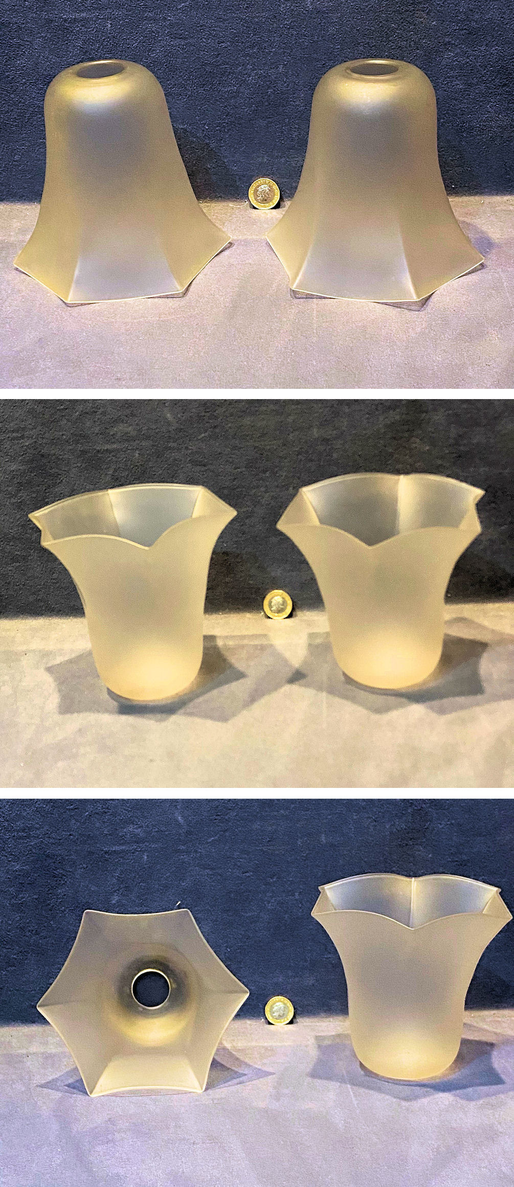 Pair of Frosted Glass Lamp Shades S656 Original, quality pair of 1920's frosted glass bell shaped electric light shades with six panels. Will fit standard, modern UK electric bulb holders. All are complete and in good and working order.