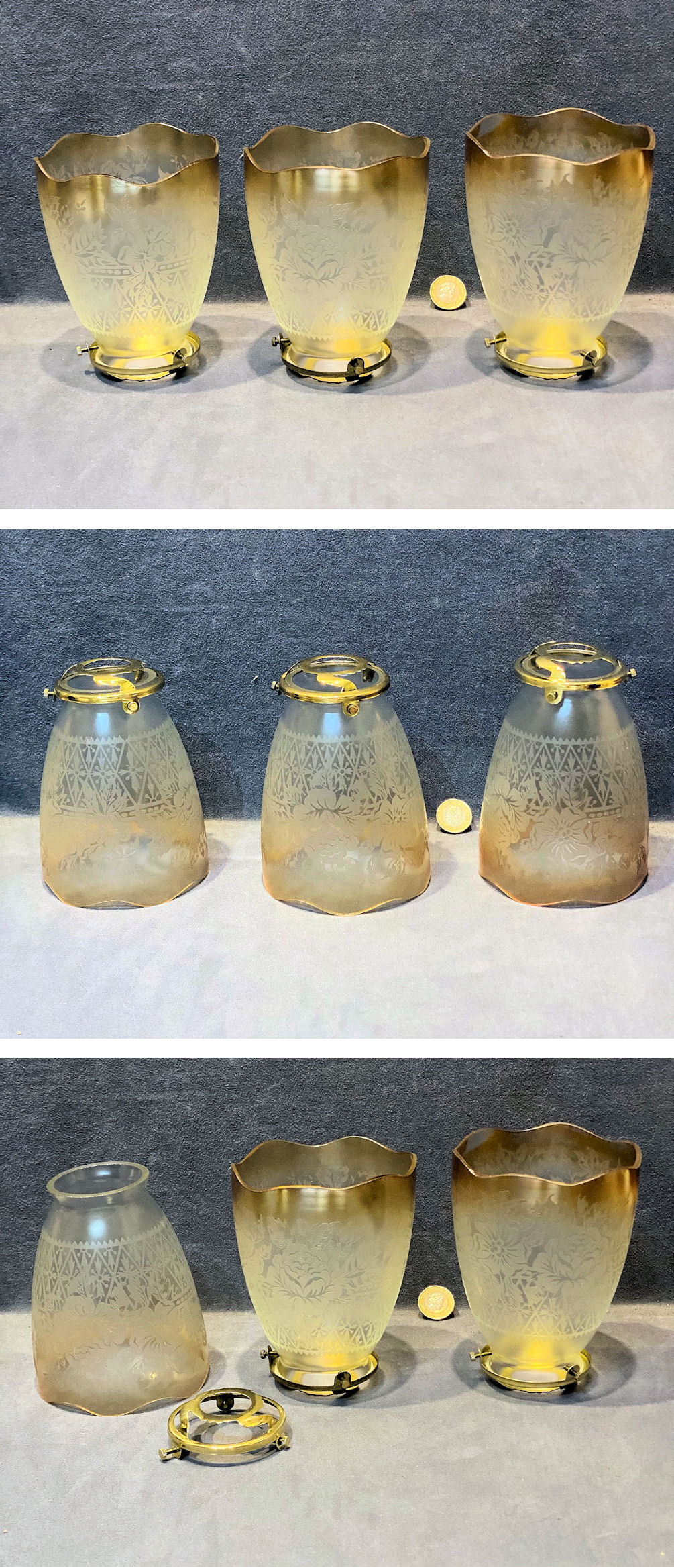 Set of 3 Glass Lamp Shades S655 Original, quality late 19th century continental glass gas shades fitted with replacement brass shade holders to fit standard, modern, UK electric bulb holders. This set is acid etched with designs of flower heads in clear glass with an amber coloured wavy outer rim and can be used both up or down. All is complete and in good and working order.