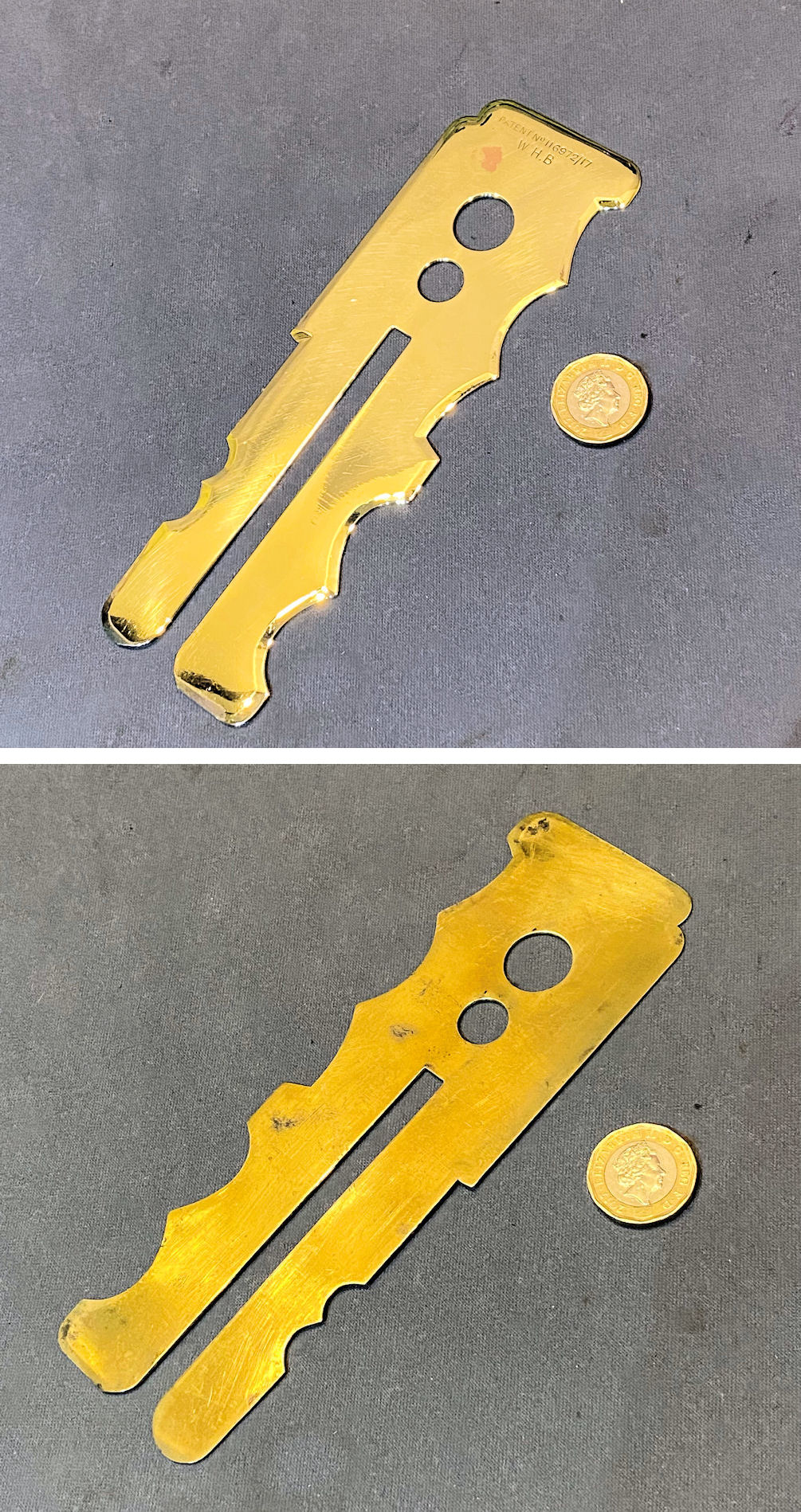 Military Button Stick M160 Original, quality First World War brass button stick used for polishing the brass buttons on military and similar uniforms protecting it from the polishing liquid. This example is impressed to the top front with the patent number for the year "1917" and "W.H.B". Polished and lacquered, although the lacquer may be removed at no extra cost and complete and in good order.