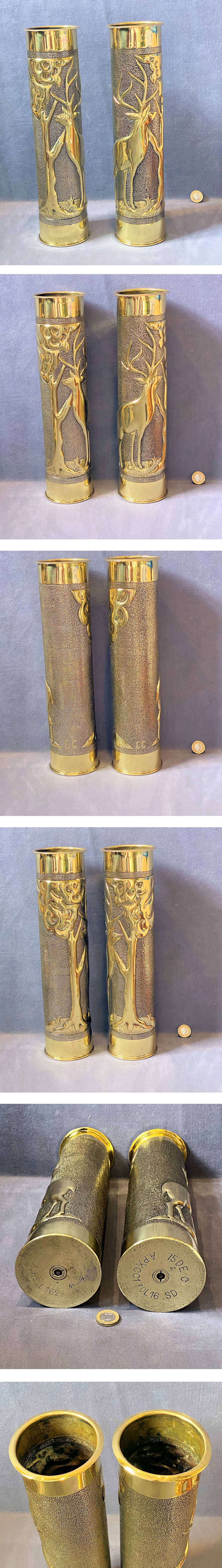 Pair of Trench Art Brass Shell Cases SC312 Original, quality pair of Second World War brass shell cases, trench art decorated with embossed details of a stag beside a tree, each facing away. The top rims have been turned over and the undersides are impressed to one "ARSL", "1624", "RS" and the other "75 DEC APXCC170, 46SD". All have been polished and lacquered, although the lacquer may be removed at no extra cost and are in good order.