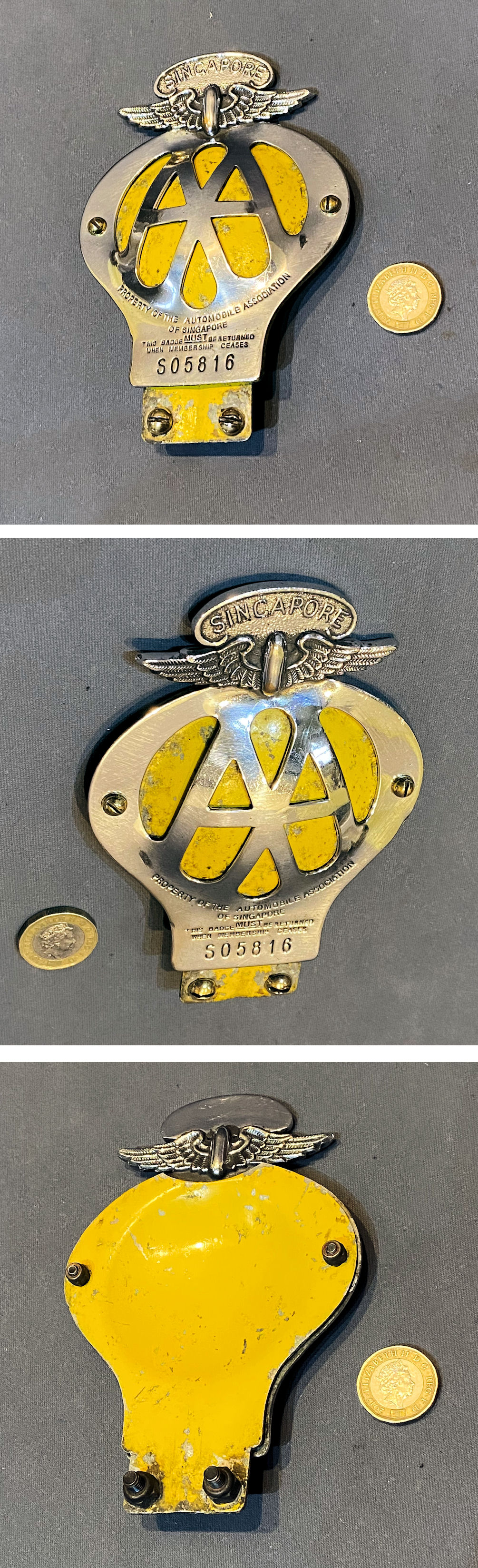 Singapore AA Badge CM63 Original, quality 1960's chromed AA (Automobile Association) motor car badge with a yellow backplate. The interlocking "A's" and the winged wheel logo at the top with "Singapore" above also below is detailed "Property of the Automobile Association of Singapore". Some scuffs to the yellow plate. Otherwise, complete and in good order.