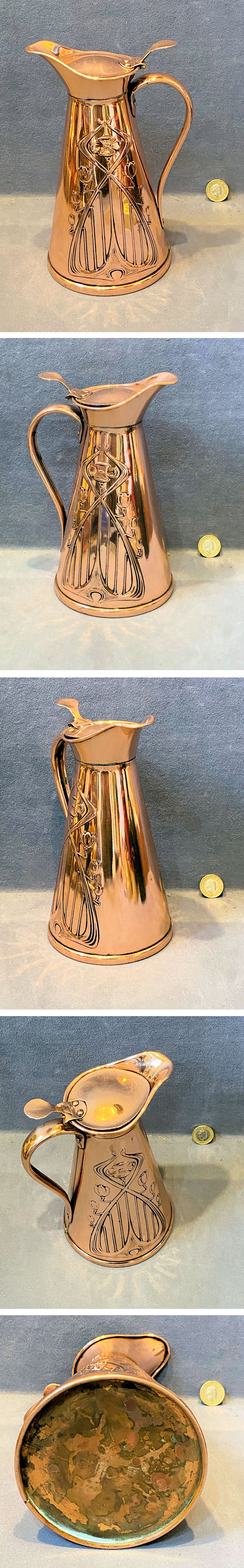 JS&S Copper Water Jug J251 Original, quality 1920's 1 1/2 pint copper water jug with a hinged lid, pouring lip and handle to the rear. This fine example is embossed on each side with serious Art Nouveau decoration. The underside is impressed "Made In England", "JS&S" for the manufacturer "Sankey & Sons" and 1 1/2 for the capacity, 1 1/2 pints. All has been polished and lacquered, although the lacquer may be removed at no extra cost and is complete and in good and working order.